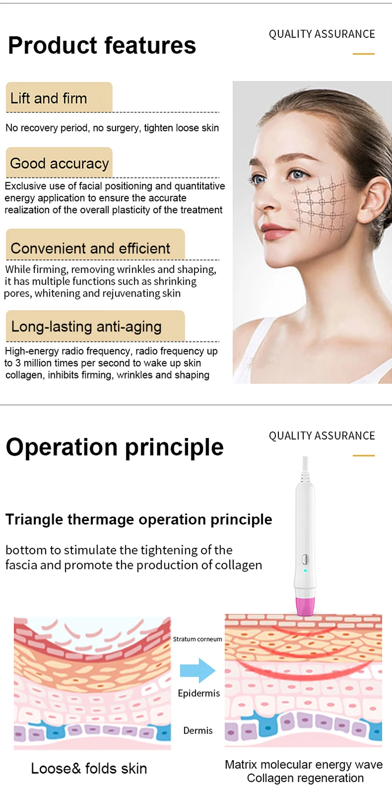 For skin sagging and wrinkles, the use of thermal conduction technology and a proprietary treatment probe to conduct radio frequency energy frequency waves at every point can send 3 million shock waves per second to deep skin, so that the collagen knitting in the dermis is heated, producing contracts, and immediately tightening and loosening Skin. It can immediately tighten the skin and stimulate the proliferation of collagen to achieve long-term skin tightening.