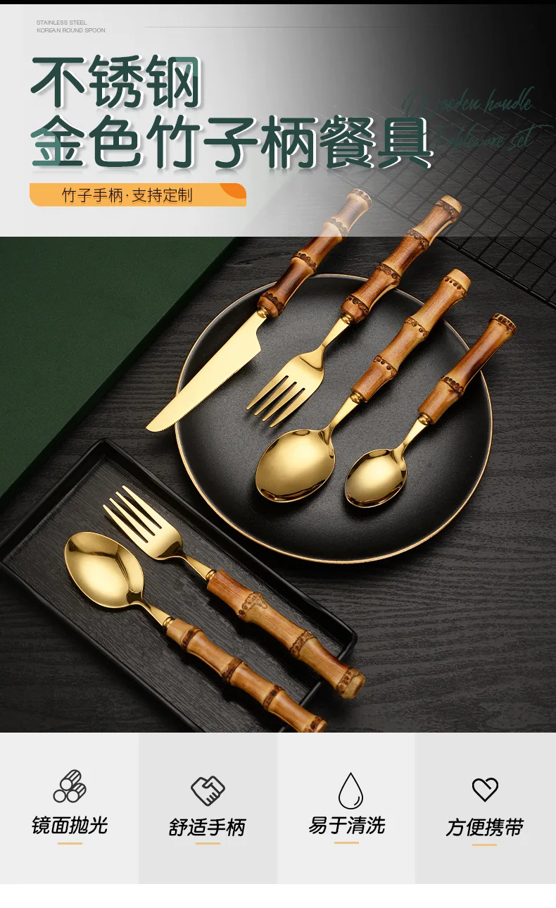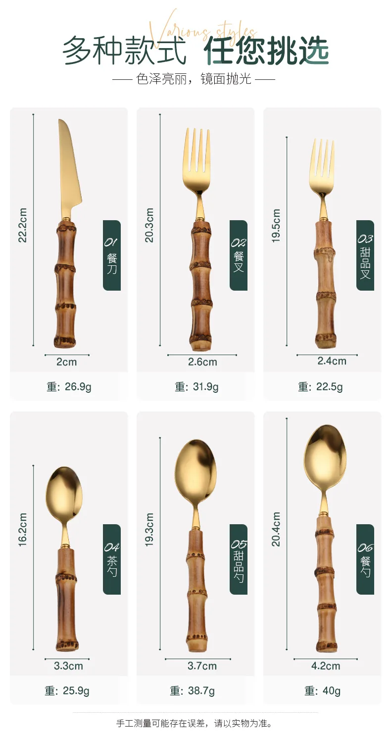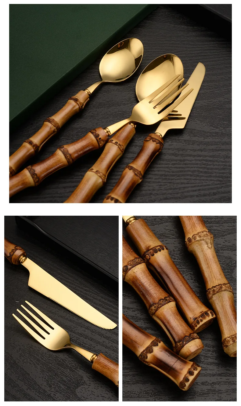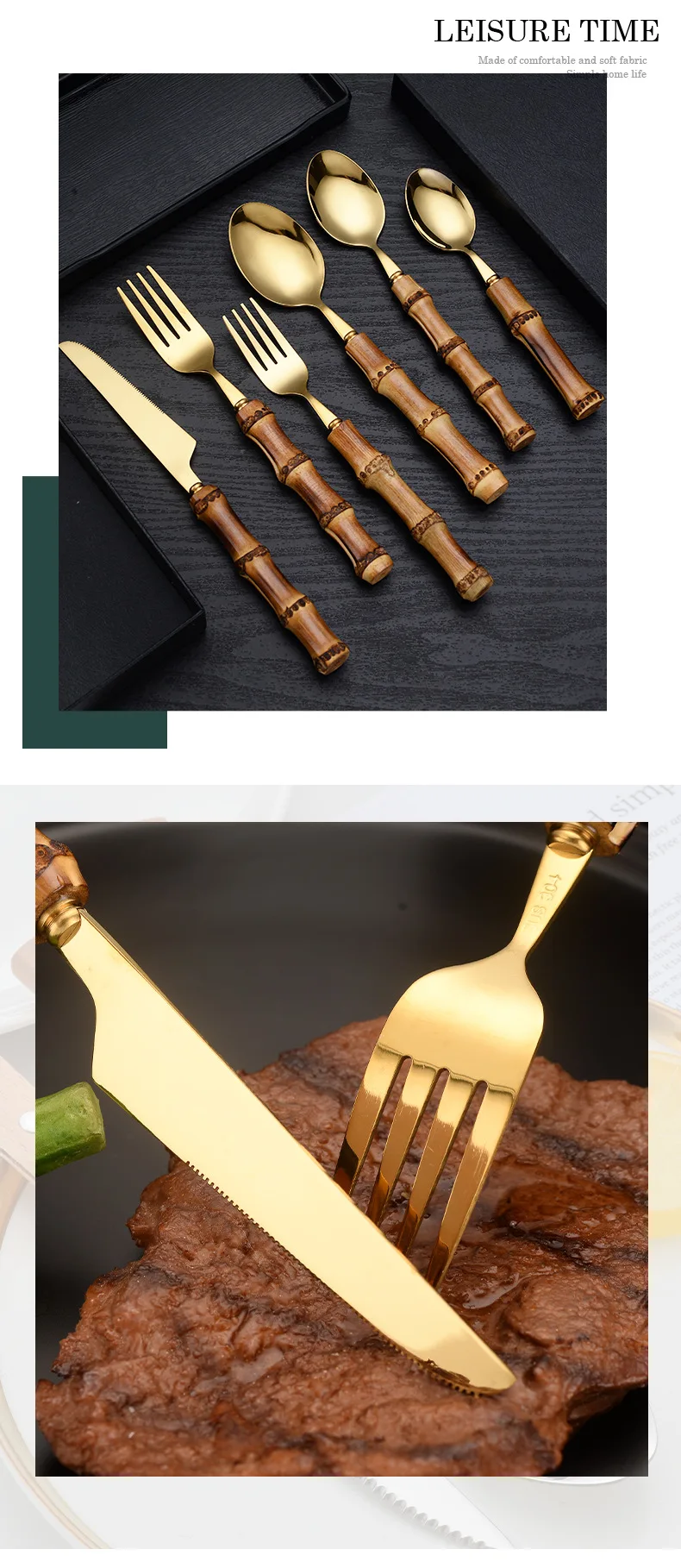 Bamboo Handle Gold Cutlery Mirror Knife Fork Dessert Spoo…