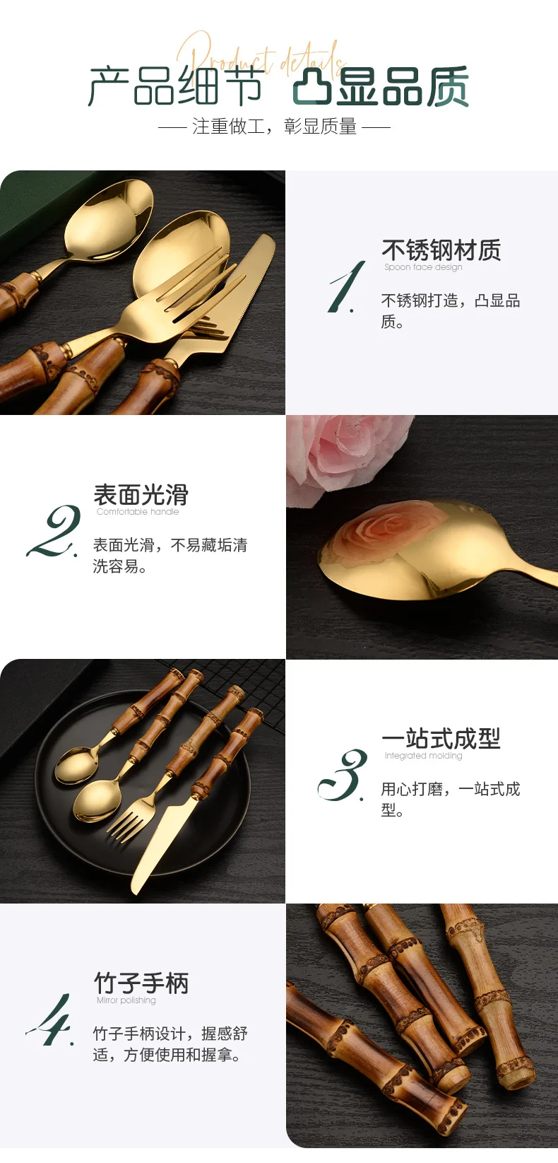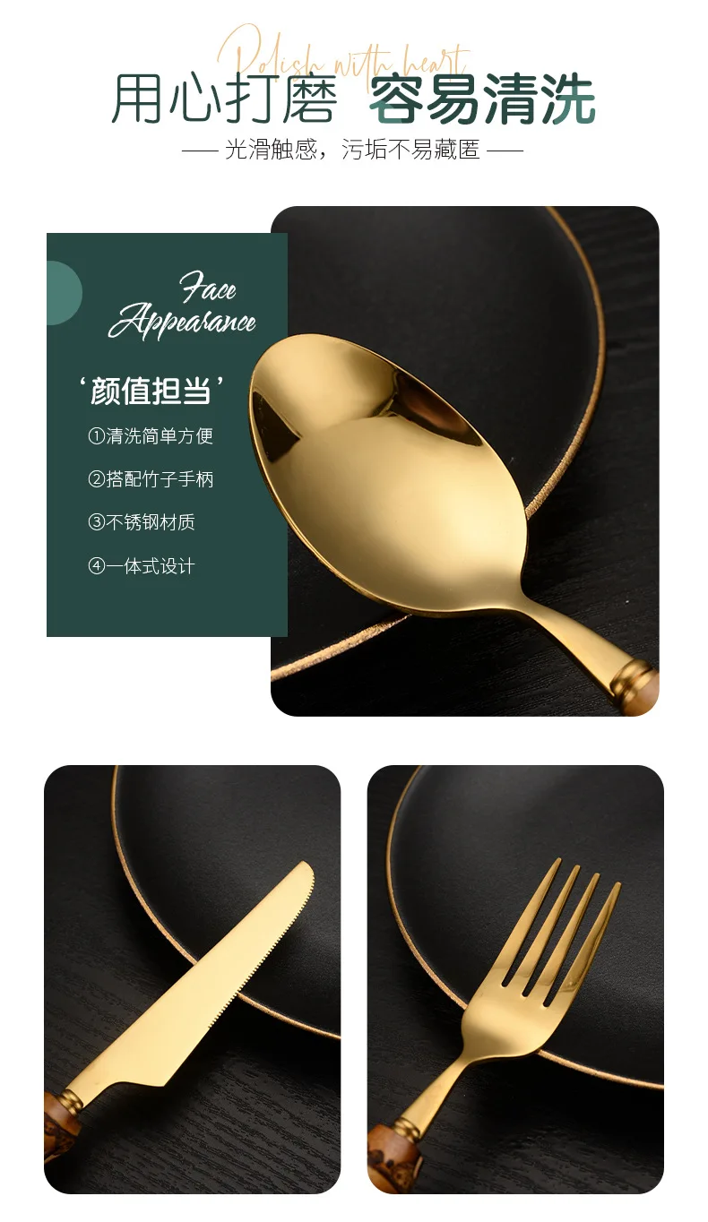 Bamboo handle stainless steel golden knife fork spoon dessert steak western tableware