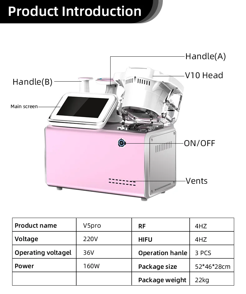 V5 PRO  has combined with the Focused Ultrasound Focused RF, vacuum,infrared light, cavitation, BIO,laser pads.  It is the new updates of V10 velashape +v4 ultrashape technology.
