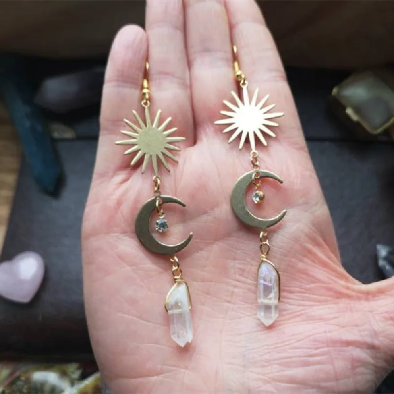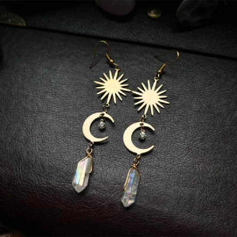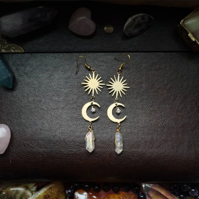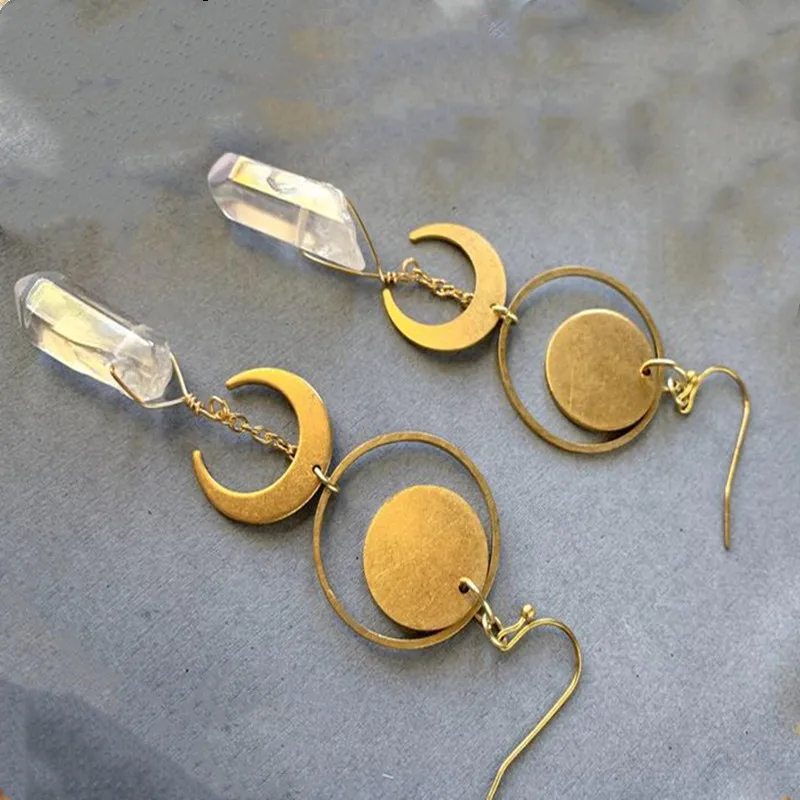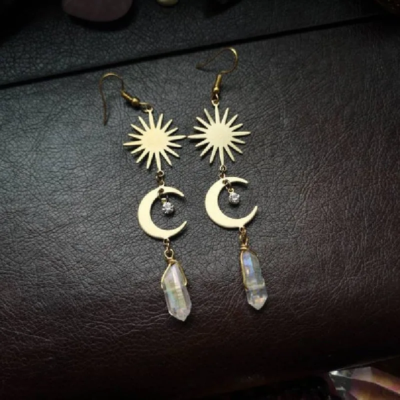 Quartz crystal accented with brass celestial charms ~ Earrings are about 2 1/2″ long