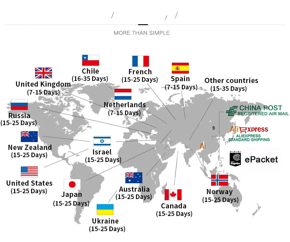 Packages from our warehouse in China will be shipped by ePacket or EMS depending on the weight and size of the product. Packages shipped from our US warehouse are shipped through USPS.