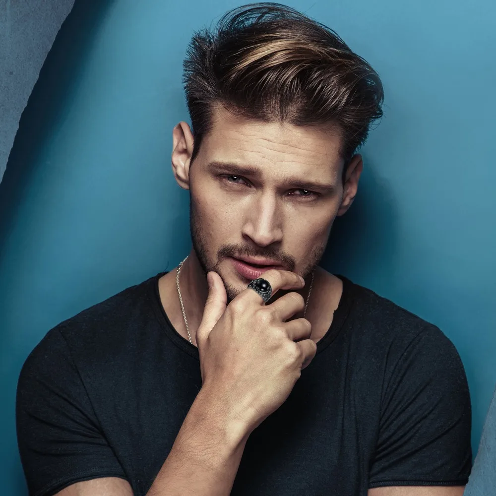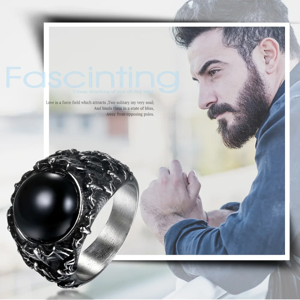 BONISKISS Retro Vintage Gothic Black Agate Stainless Steel Men’s Ring With Tiger Eye Natural Stones Jewelry
