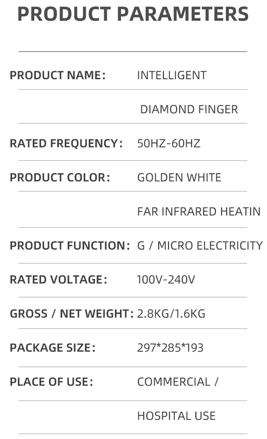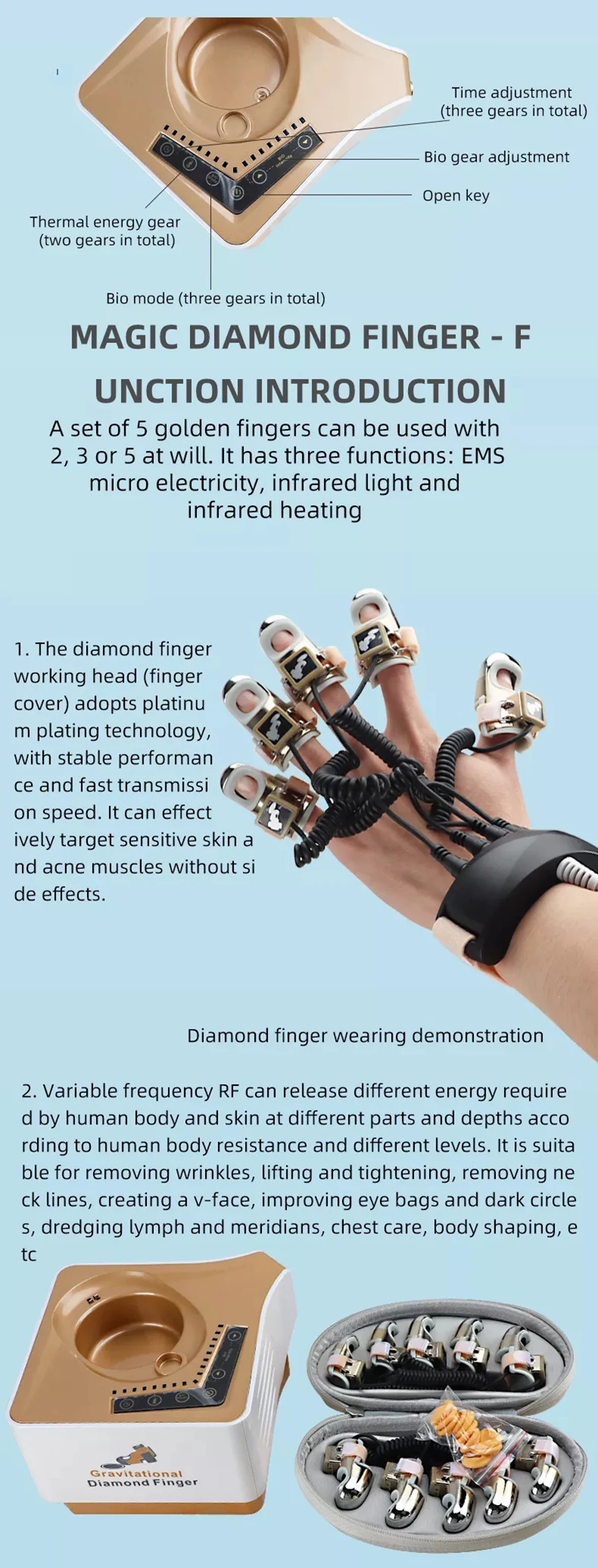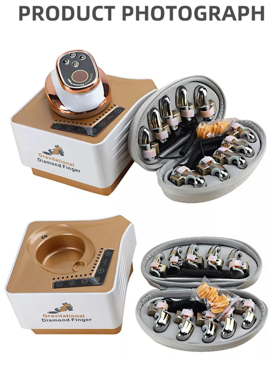 Magic Diamond finger, Gravitation instrument It can be charged directly on the instrument, Diamond finger Wear on fingers, The big one is the thumb, (index finger, middle finger and ring finger are of the same specification and medium size), small tail finger, wear on the corresponding hand, There are 8 levels of micro electricity, 3 micro electricity modes, and 3 levels of heating. Magic Diamond finger heating and light synchronous control, There are three gears,one gears is H, two gears is L the light will Luminescence, three gears L and H the light will Luminescence together.