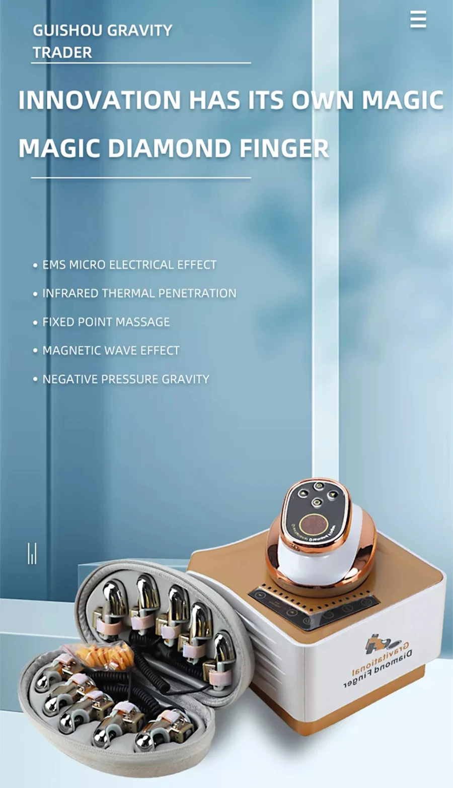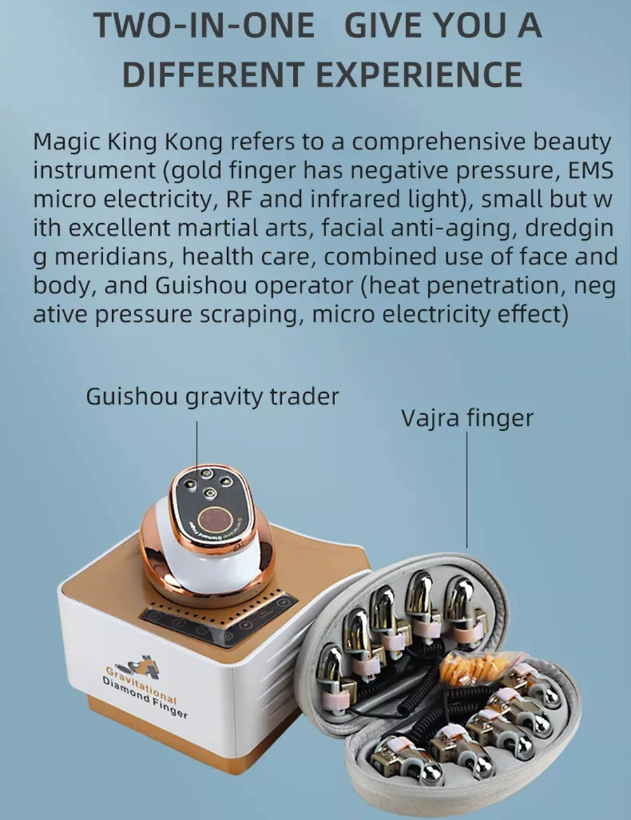 Magic King Kong refers to a comprehensive beauty instrument ( gold finger has negative pressure , EMS micro electricity , RF and infrared light ) , small but with excellent martial arts , facial anti-aging , dredging meridians, health care, combined use of face and body, and Guishou operator ( heat penetration , negative pressure scraping , micro electricity effect )