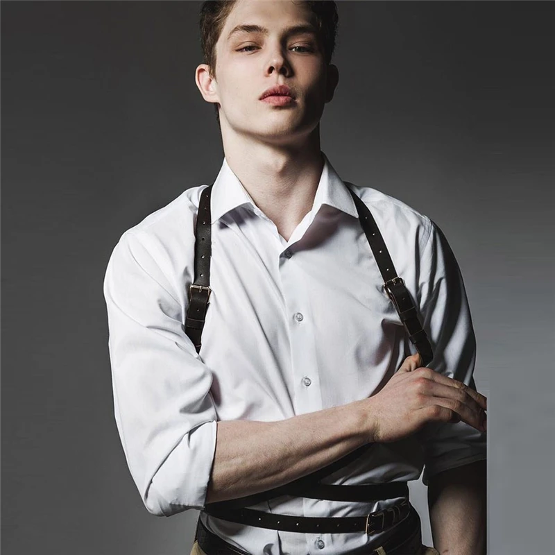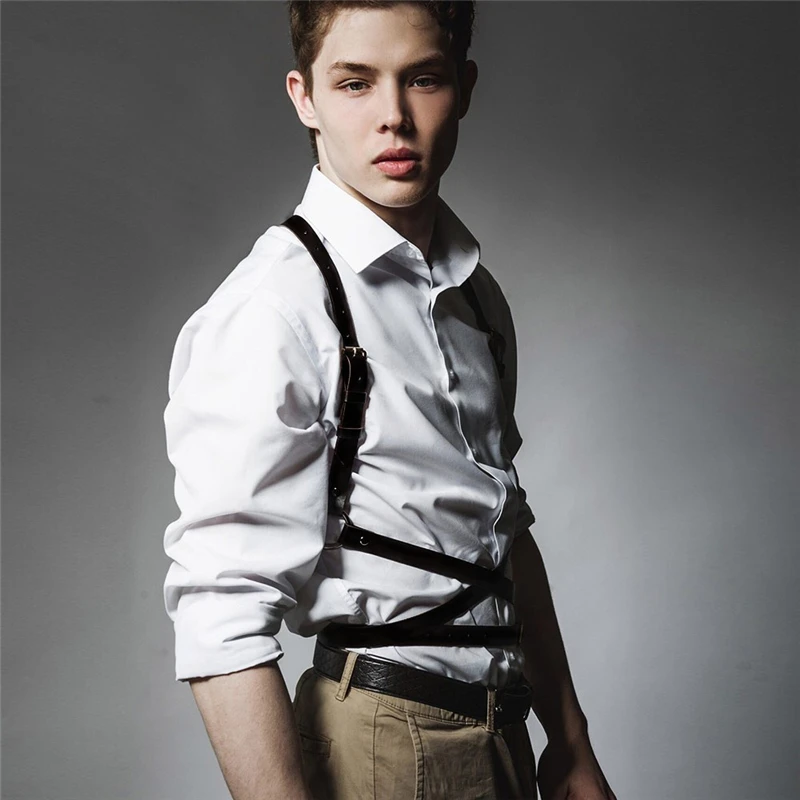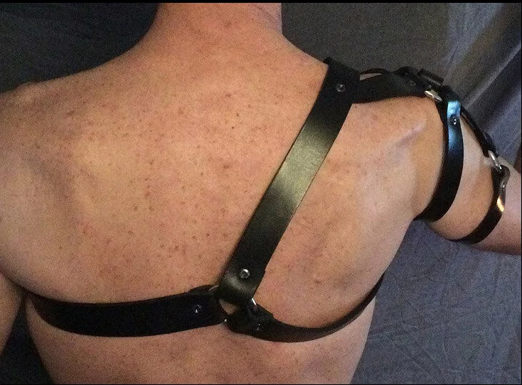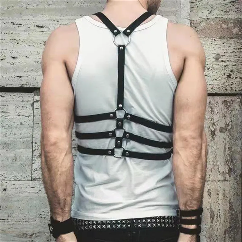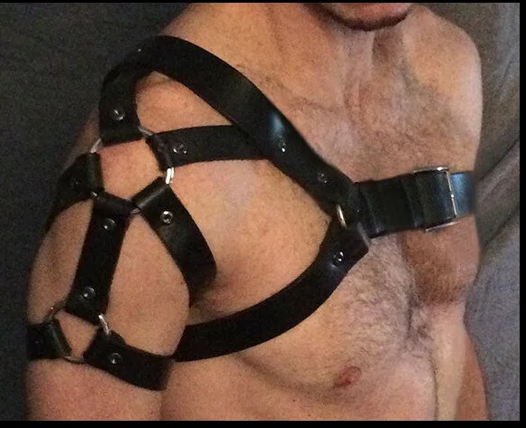 Men’s leather chest strap harness, metal studs and rings, adjustable buckles, one size fits for most