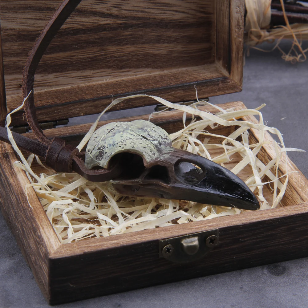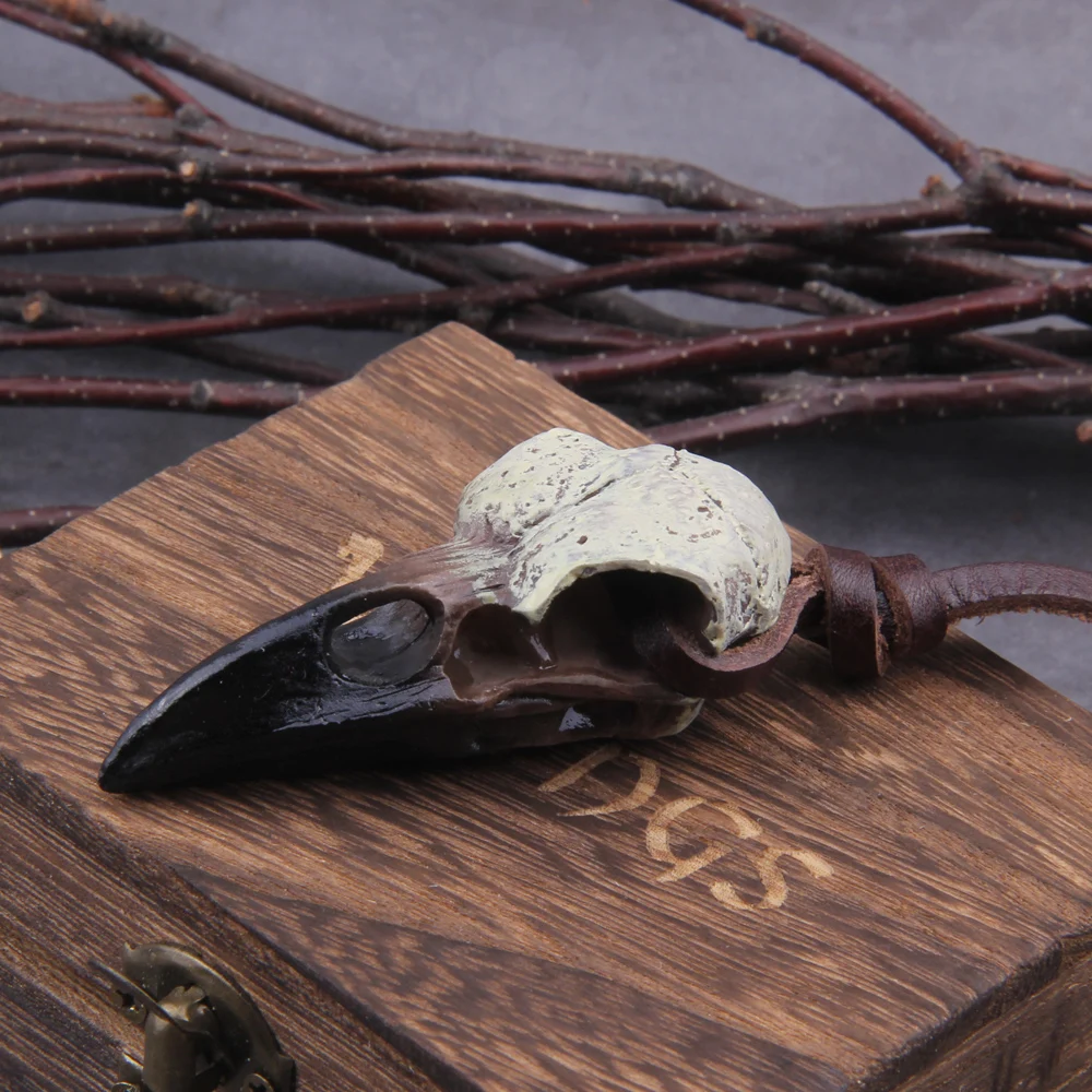 Name:3D Goth Raven Skull Necklace Resin Replica Raven Magpie Crow Poe Gothic Gift,Halloween Raven Skull Necklace with wooden box