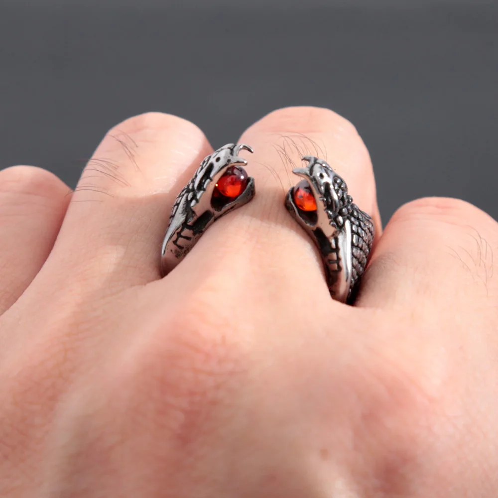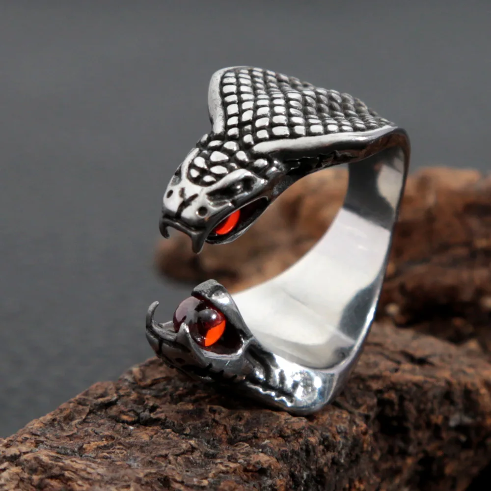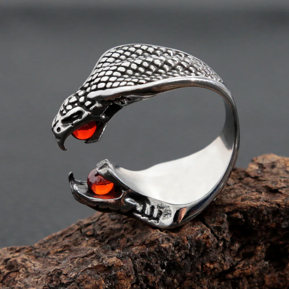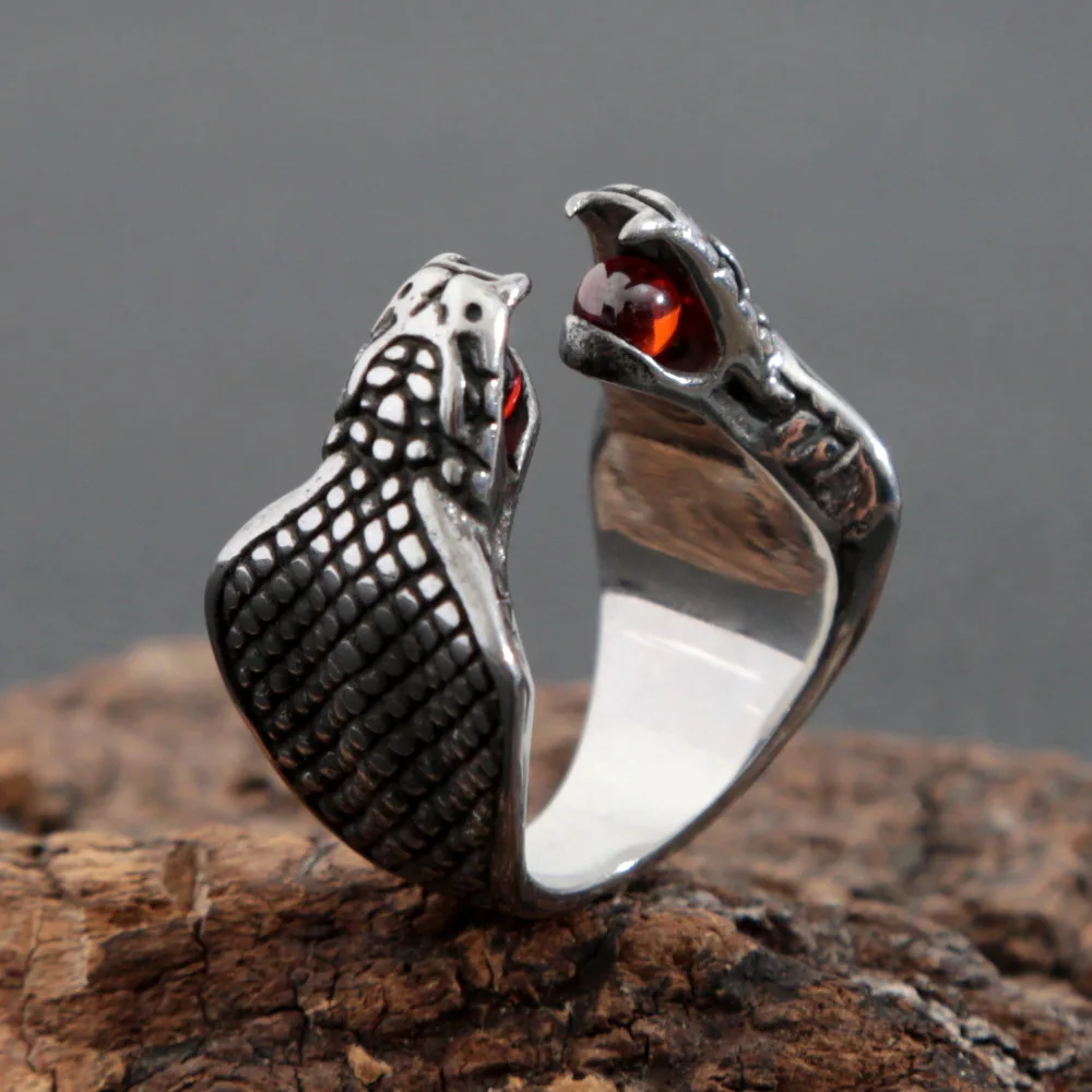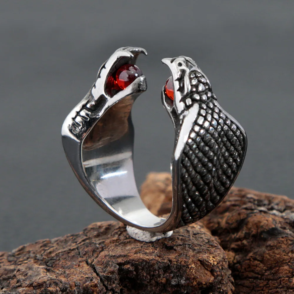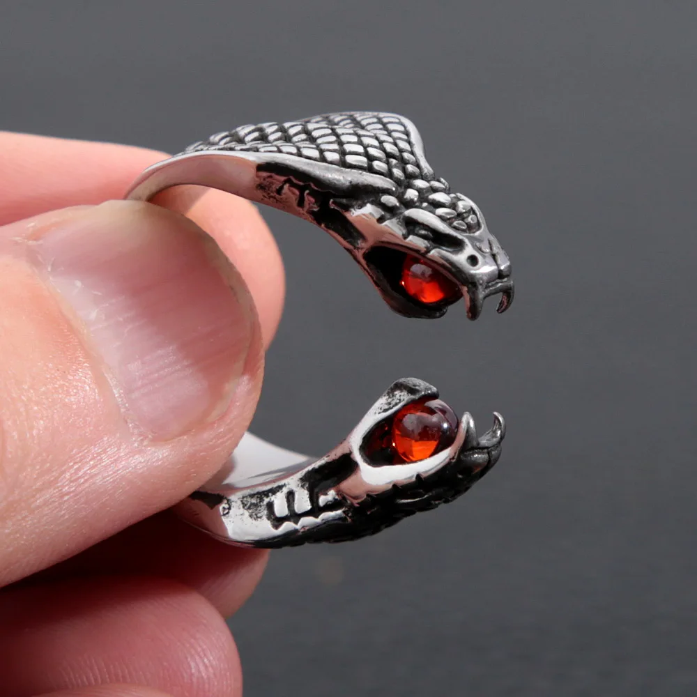Name:Gothic Double Snake Head Stainless Steel Ring Punk Opening Red Stone Cobra Snake Ring for Men Women Jewelry Gifts Wholesale