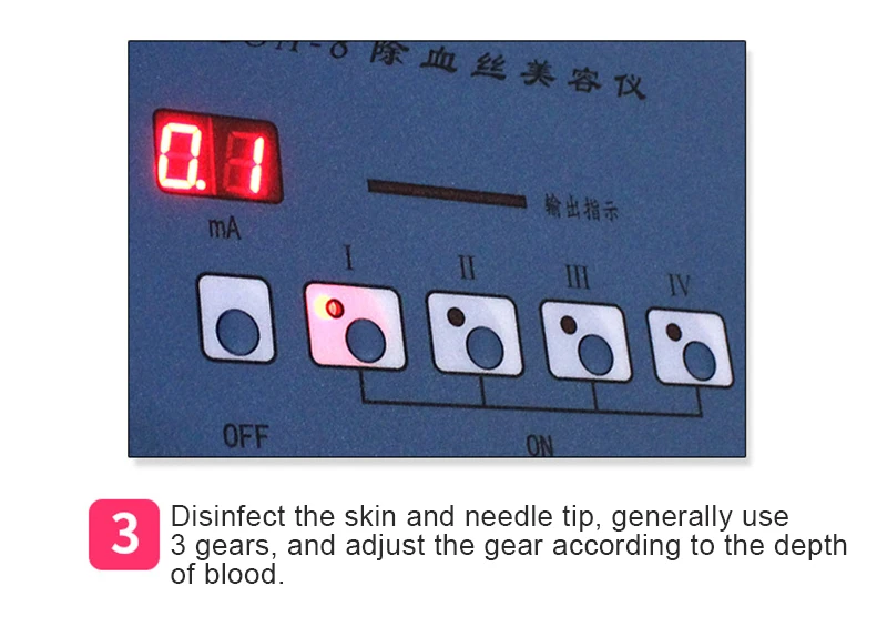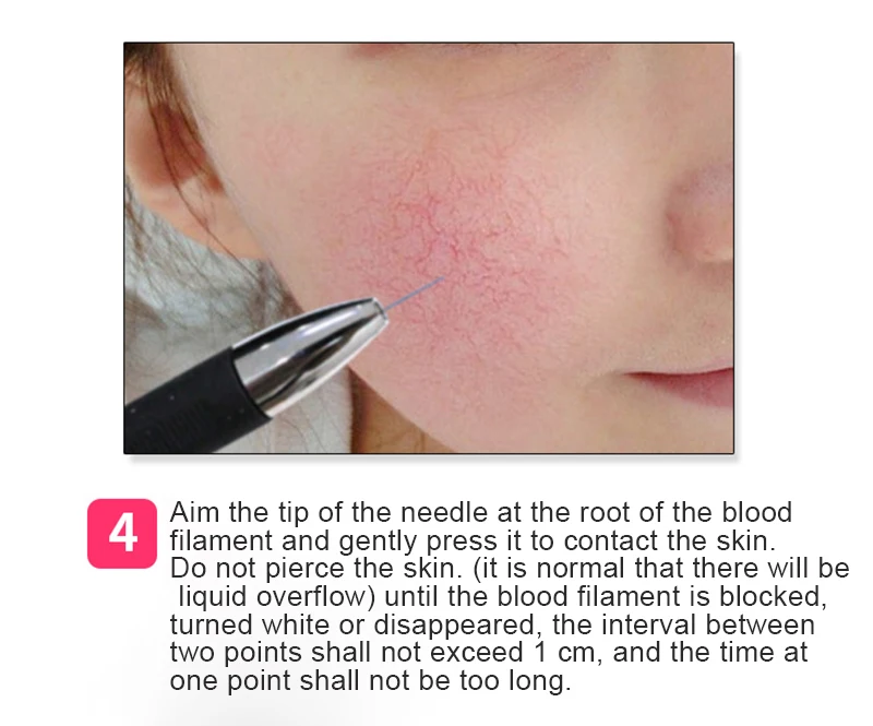 4. Align the tip of the needle with the supply point of the dilated blood vessel, or the main trunk, gently press it, and do not penetrate the skin. (There will be liquefied material precipitation is normal) When the blood vessels are blocked from whitish or disappear, the interval between every two points does not exceed 1CM, and it cannot be too long.