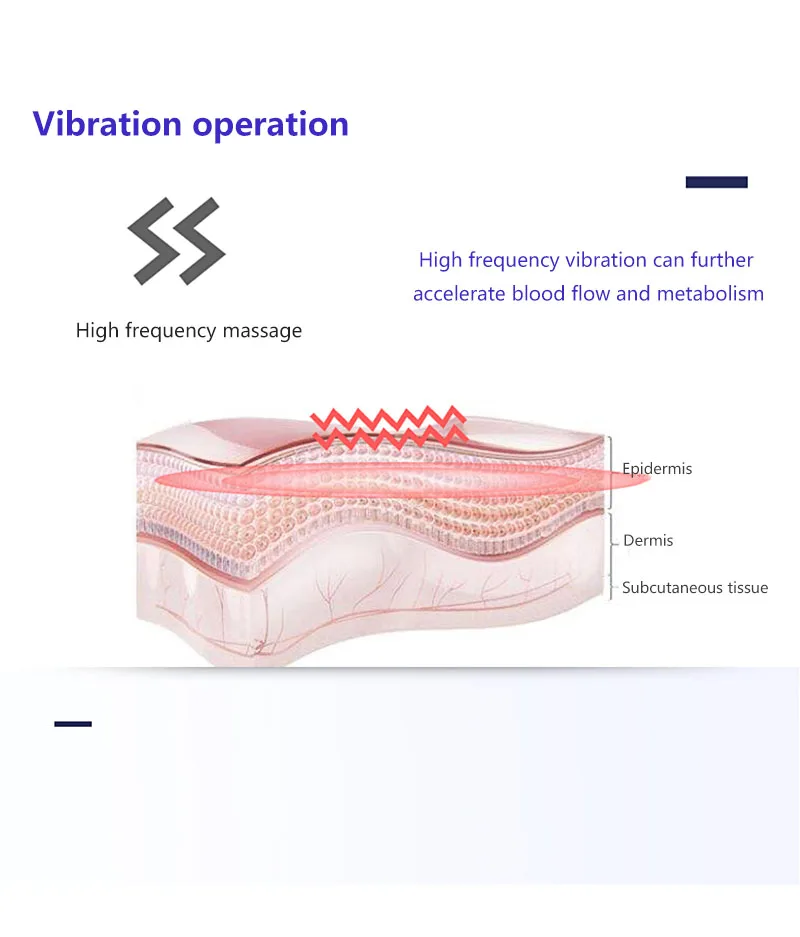 (1) Radio Frequency Mechanism: RF waves penetrate through epidermis to dermis and heat the dermis collagen fiber to 55°C-65°C. Collagen fiber shrink and loose skin is tightened. At the same time, the radio frequency heat stimulated collagen regeneration to recover skin elasticity and remove wrinkle.