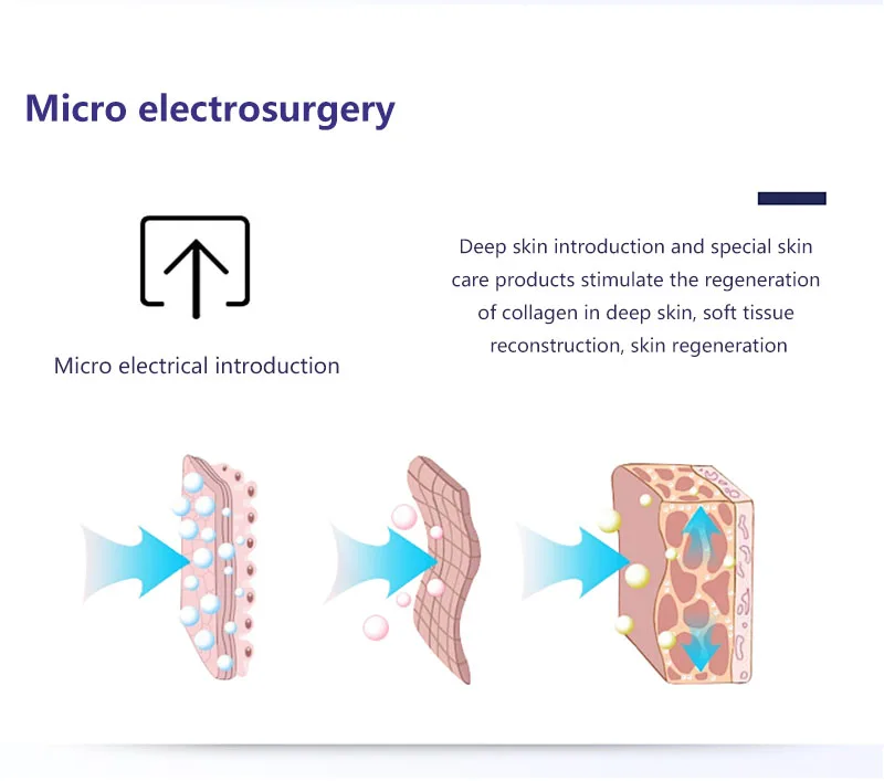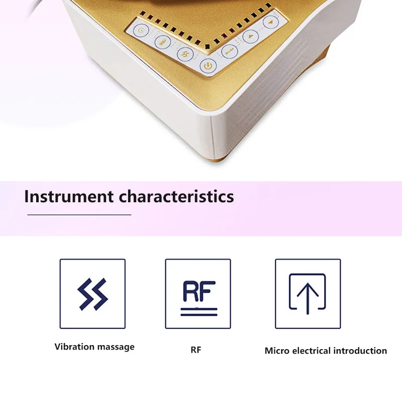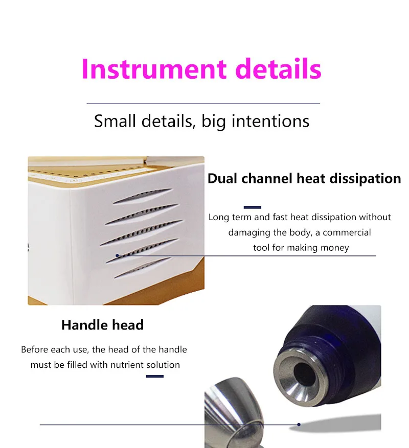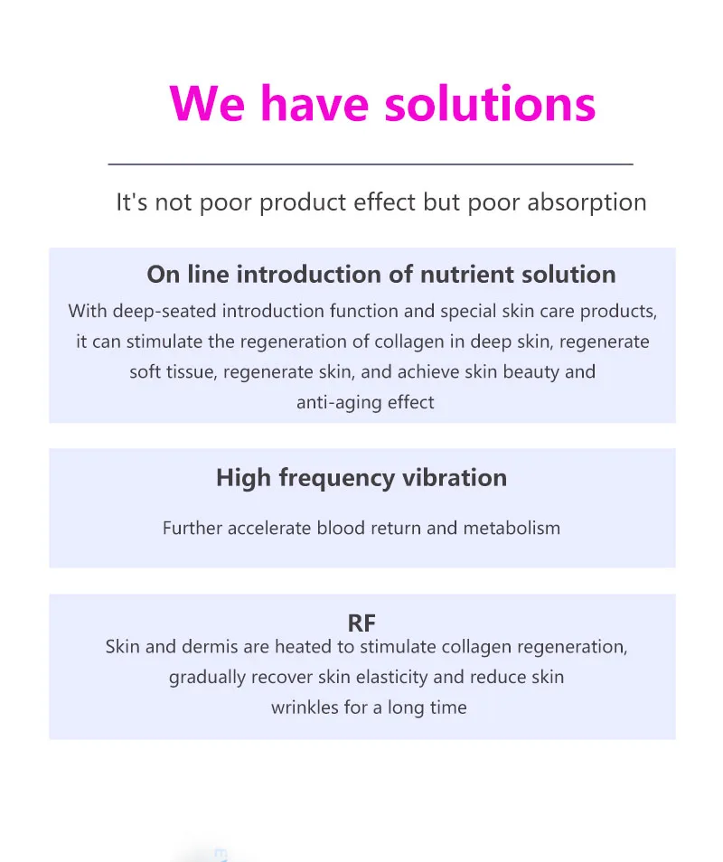 (4) Nutrient solution leading Mechanism: Radio Frequency has strong deep leading function, it can lead special nutrient solution to deep tissue to stimulate the deep collagen regeneration, rebuilt soft tissue, so we get perfect refresh skin.