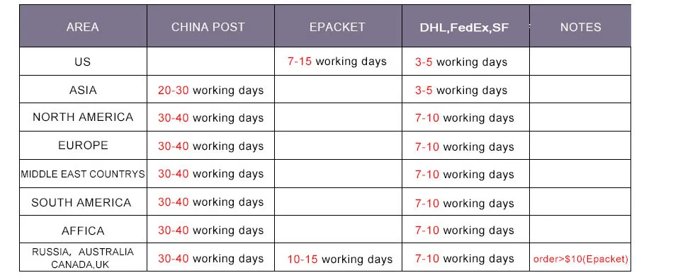 Packages from our warehouse in China will be shipped by ePacket or EMS depending on the weight and size of the product. Packages shipped from our US warehouse are shipped through USPS.