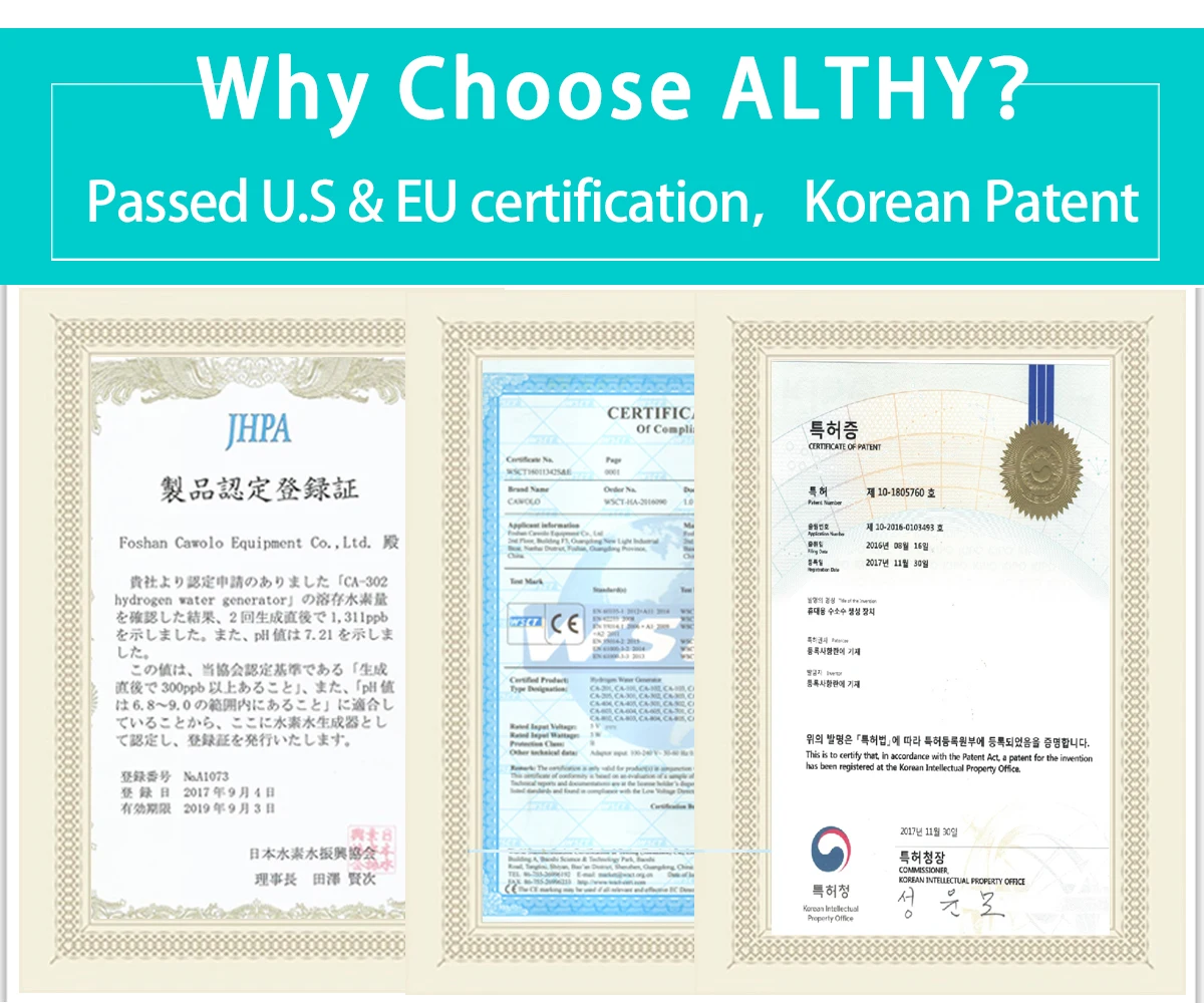 ● 100% safe to drink, Hydrogen purity reached 99.99%. Oxygen, chlorine and ozone are separated out, discharged from the bottom waste gas vent device.