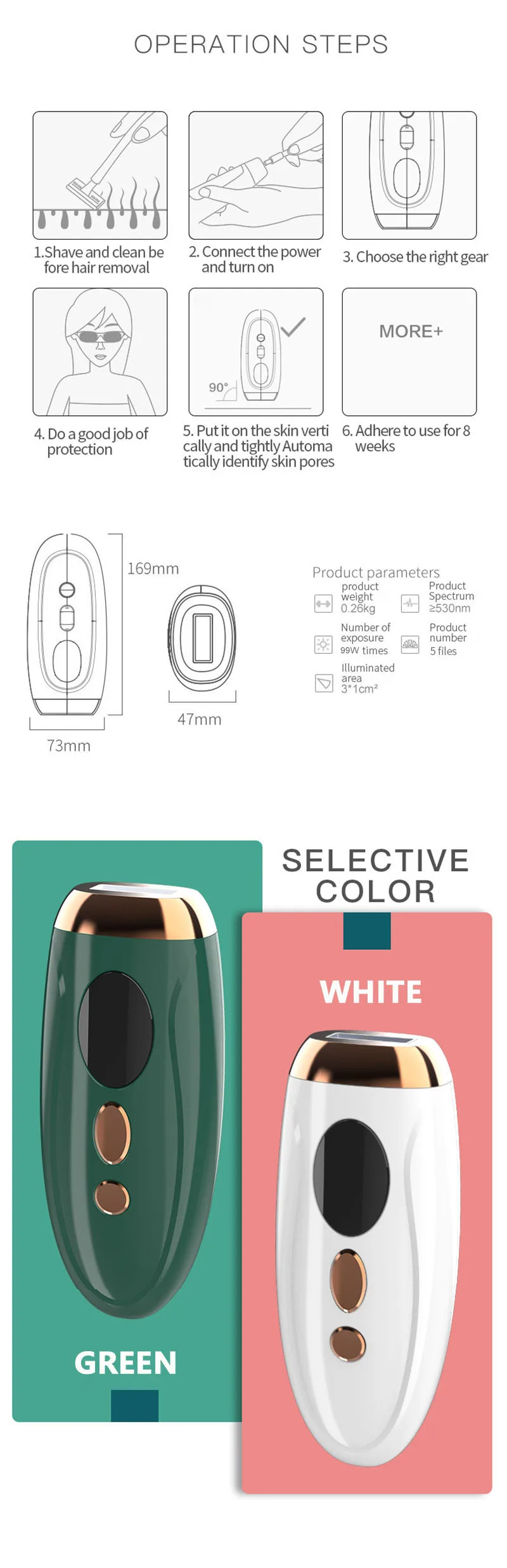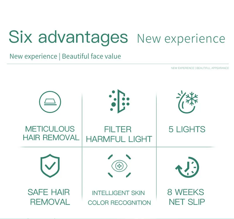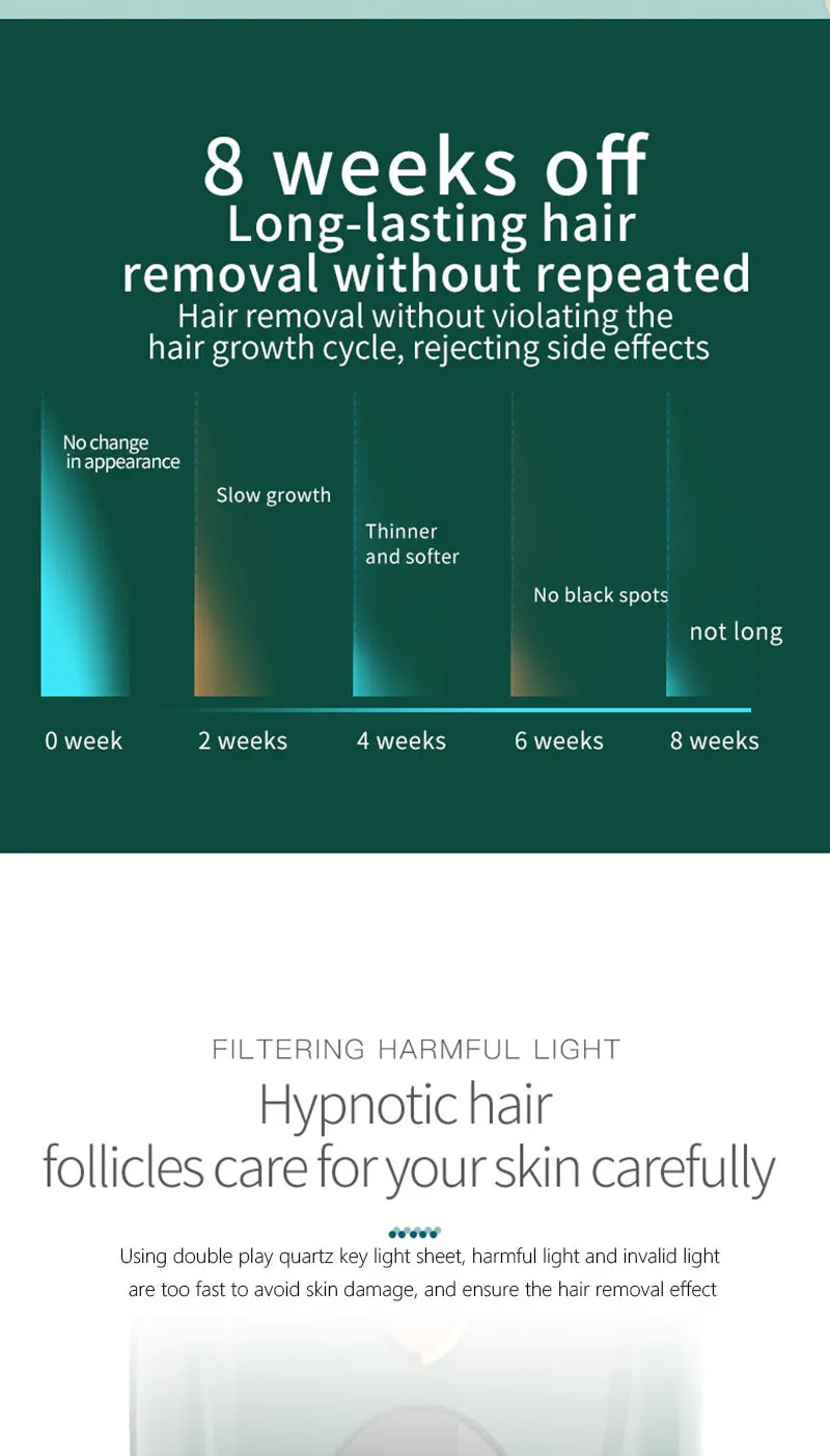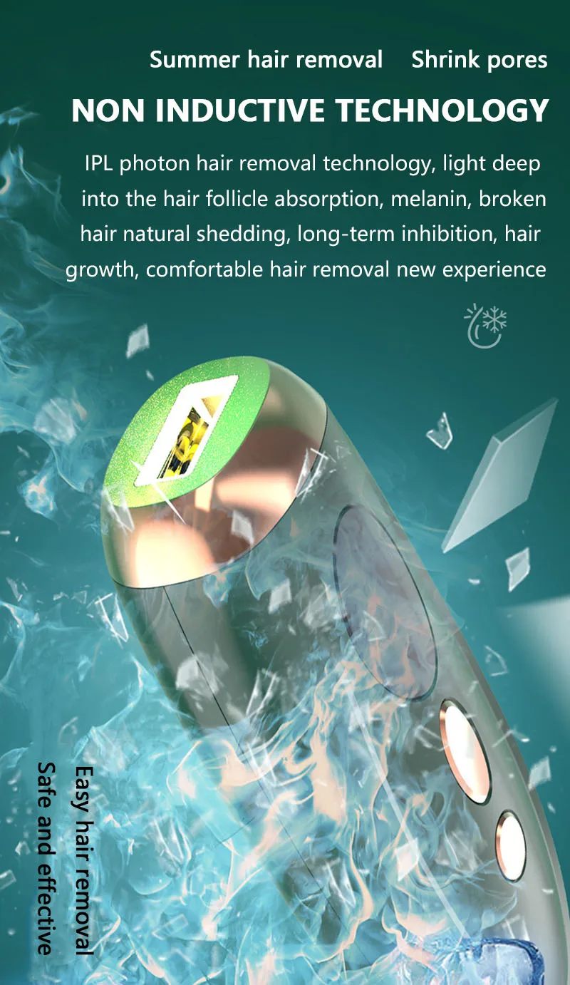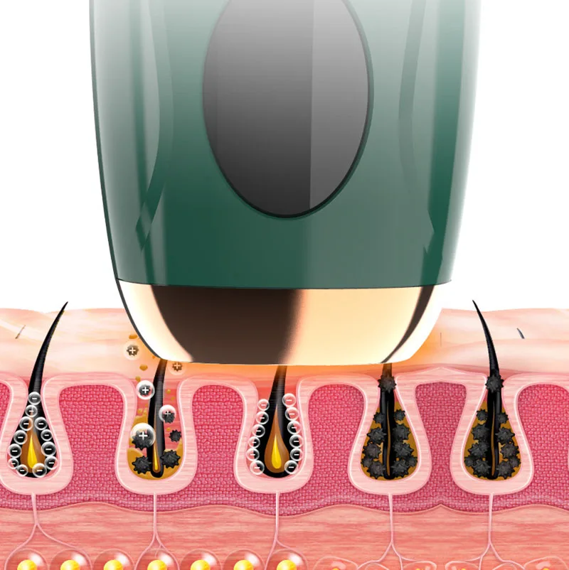 IPL photon hair removal technology, the wavelength of 640-1200NM. Can penetrate the epidermis, the selective role in the hair follicles, because hair follicles rich in melanin, very easy to absorb the laser. Long time absorption of light will destroy the hair follicles, due to photon therapy, the relative Safe, and without any pain, without any damage to the skin, will not affect your work or life,At present photon technology has been widely used, its principle is based on photon selective photo thermal effect principle, in the growing hair follicles full of pigment, easy to absorb light, while rest is relatively insensitive hair, which will not damage the hair roots , Most hair follicles in the resting period, so this requires long-term use, to complete the permanent hair removal.