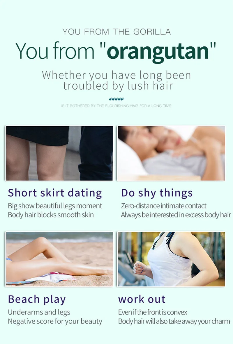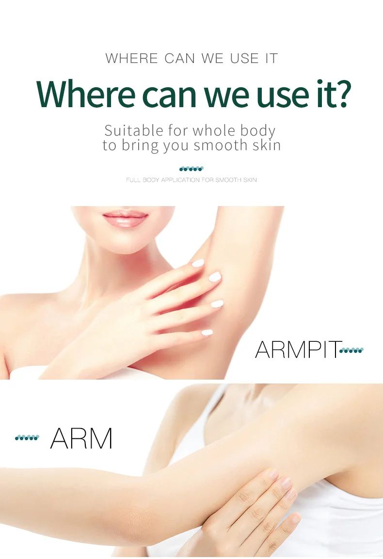 4. Suitable for the underarms, legs, bikini line, face,body,No side effects on skin or body.