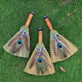 About 30cm Wiccan raw crystal column moon accessories feather broom decor Witch broom altar decor Home Protection Banish Evil