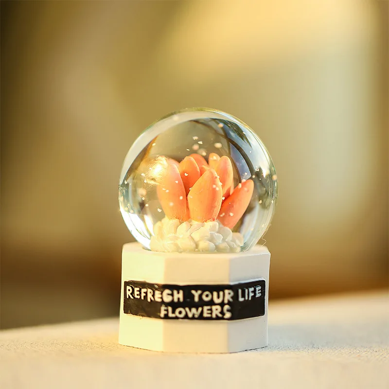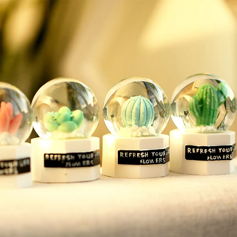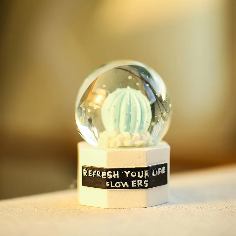 Mini Cactus Crystal Ball Music Box Succulent Plants Glass Ball with Colorful LED Light Desk Ornaments Birthday Christmas Gift