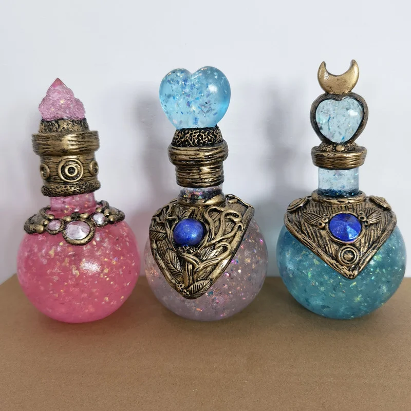 Material: A hand-made potion bottle decorated with rose quartz moon and crystals, made of finely crafted resin, is durable and can stand the test of time.