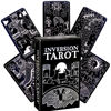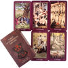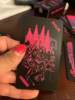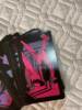 The cards are smaller than the average tarot deck — perfect for travel as they are more compact. The cards are flexible and shuffle/cut/spread easily. The images are very cool. Tri-chromatic (pink, purple/grey, black). The suits are not standard tarot names, instead they are Wires (wands), Vials (cups), Arms (swords), and Zents (pentacles). Also the names of the face cards are different— Apprentice (Page), Agent (Knight), Supervisor (Queen) and Executive (King). This may present challenging for a newer tarot reader who is unfamiliar with the standard tarot deck cards to begin with. This deck did not come with a pocket pamphlet or book as described, which was disappointing and why I have knocked down a star.