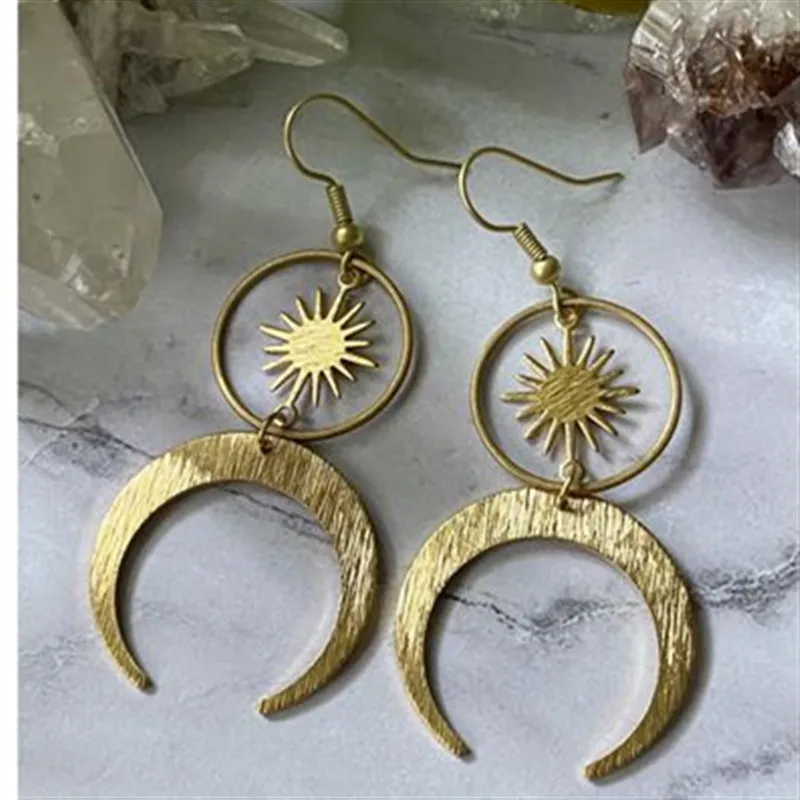 Hippie Tribal Sun Crescent Earrings Brass Color Witchy Bo…