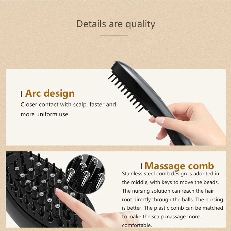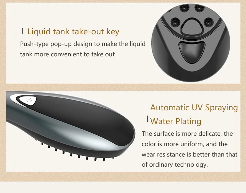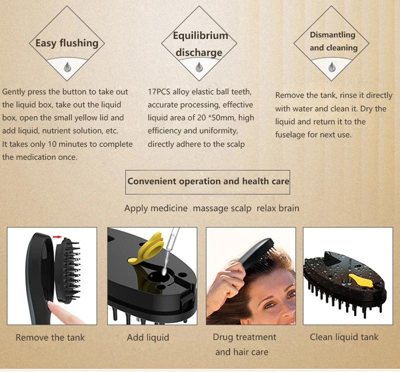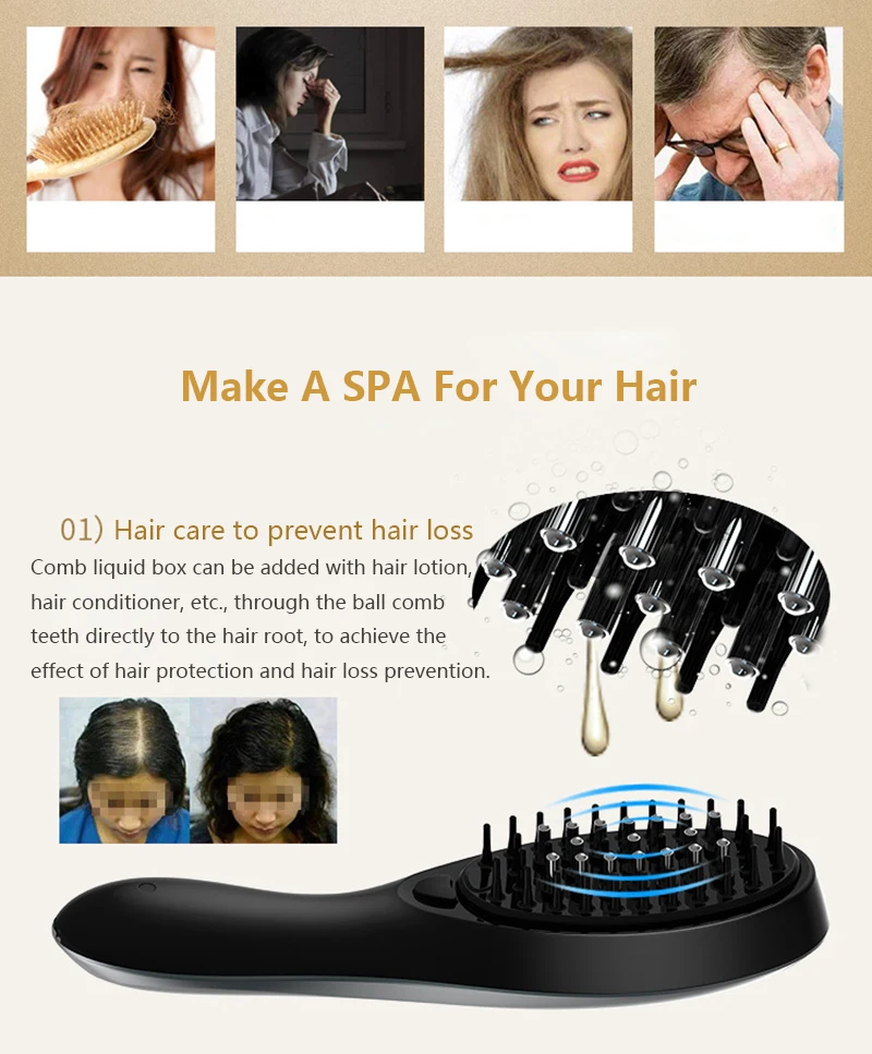 Comb liquid box can be added with hair lotion, hair conditioner, etc., through the ball comb teeth directly to the hair root, to achieve the effect of hair protection and hair loss prevention.