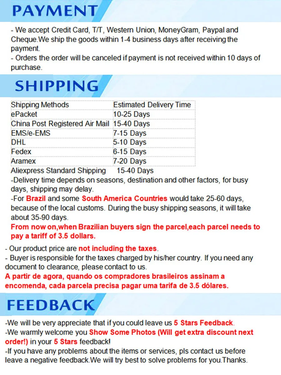 We are not responsible for any custom fees once the items have been shipped. By purchasing our products, you consent that one or more packages may be shipped to you and may get custom fees when they arrive to your country.