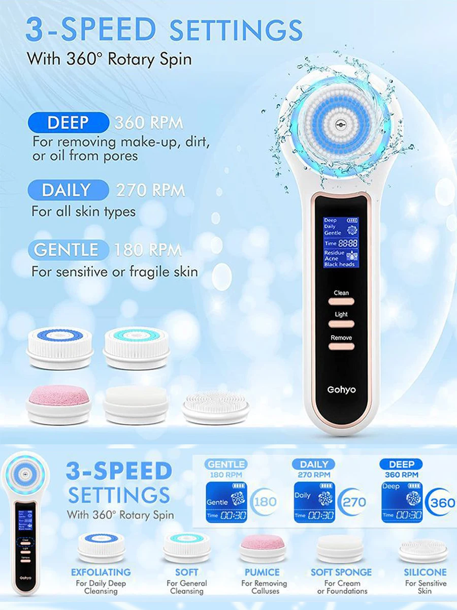 【360°ROTARY CLEANSING】Rotating brush with advanced technology,3 cleansing levels,5 brush heads,delivers superior cleansing on hard-to-remove makeup ,Gentle enough for daily use on even the most sensitive skin.Suitable for all types of skin.