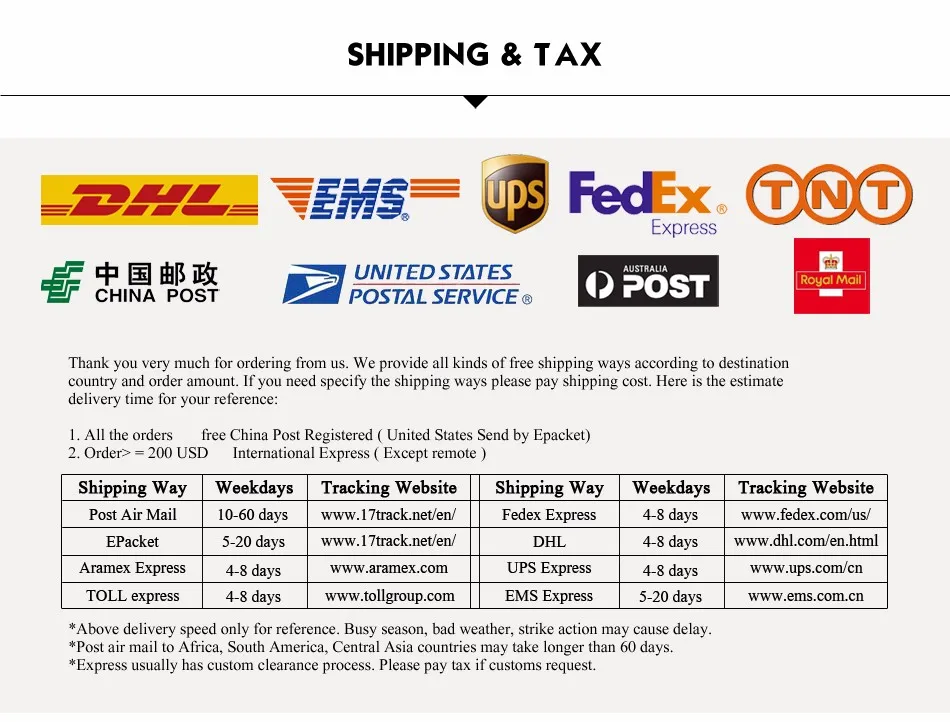 (Highly recommended to use AliExpress Standard Shipping,China Post Registered Air Mail or other Tracking logistics to ensure your order is delivered on time.)