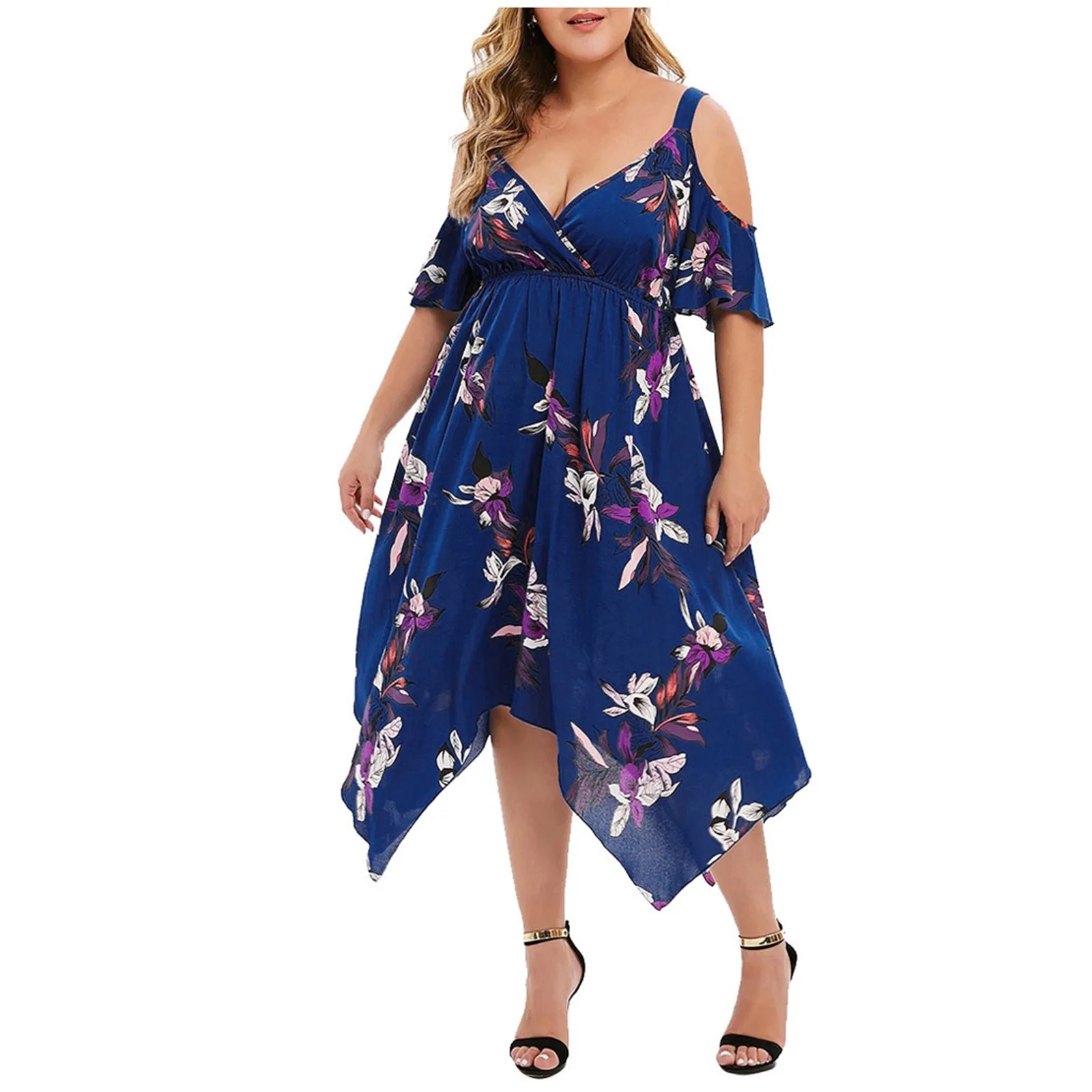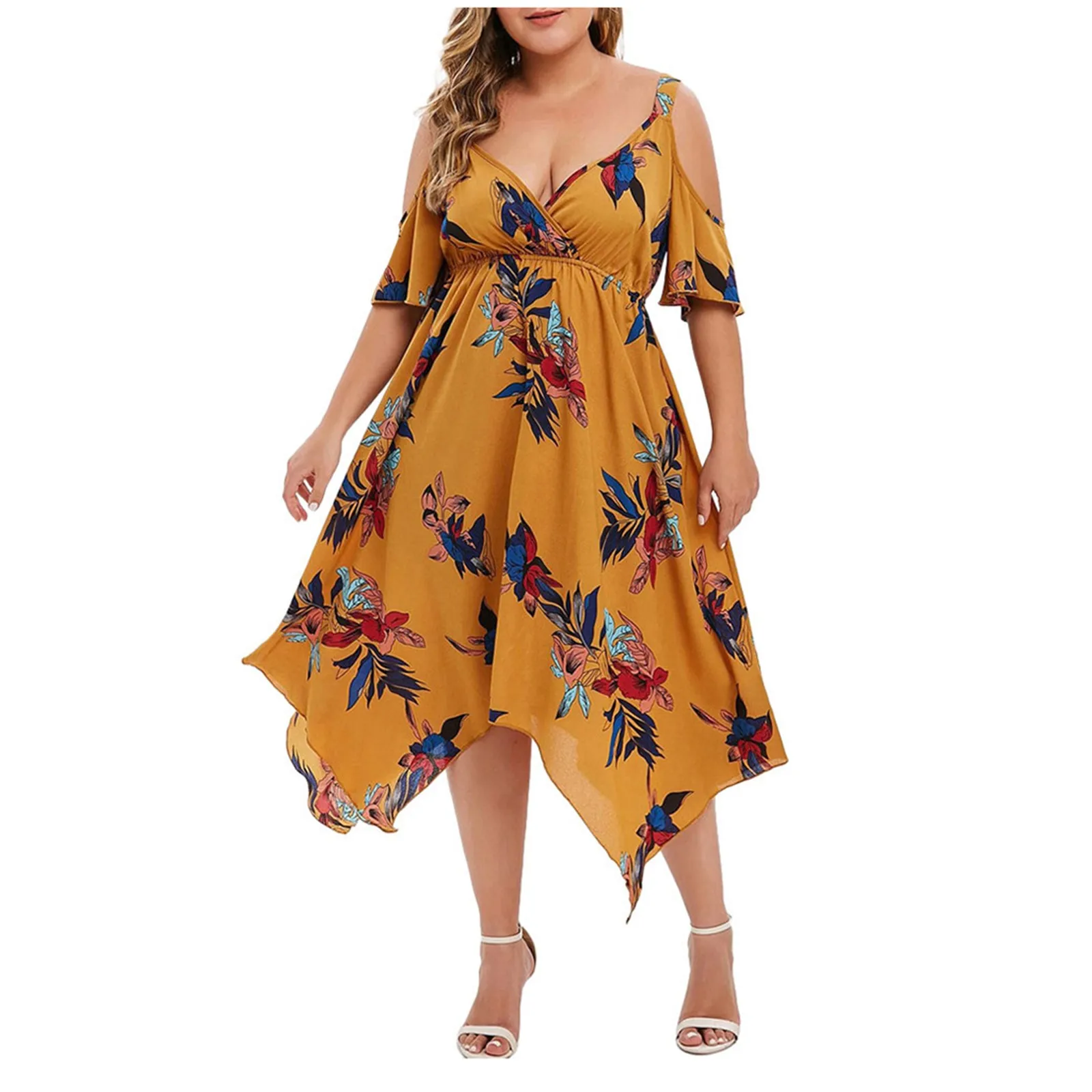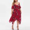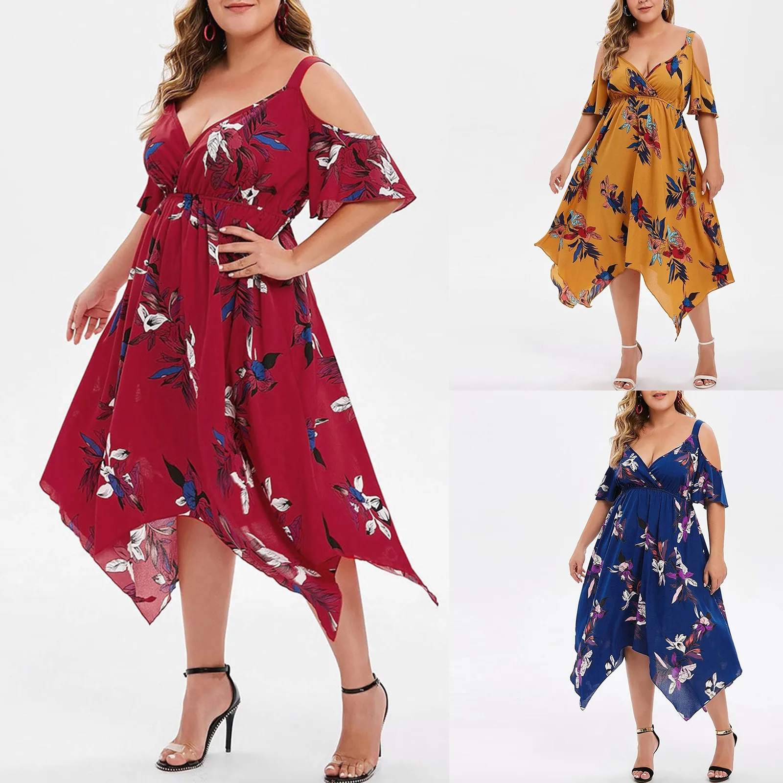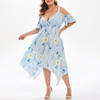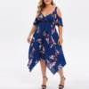 Features:V-Neck,Plus Size,Open Shoulder,Floral Printed,Handkerchief,Casual Dress,Short Sleeve,Fashion Dress, Casual Wear,Stylish and fashion design,Summer and Spring casual Dress.