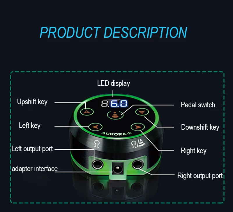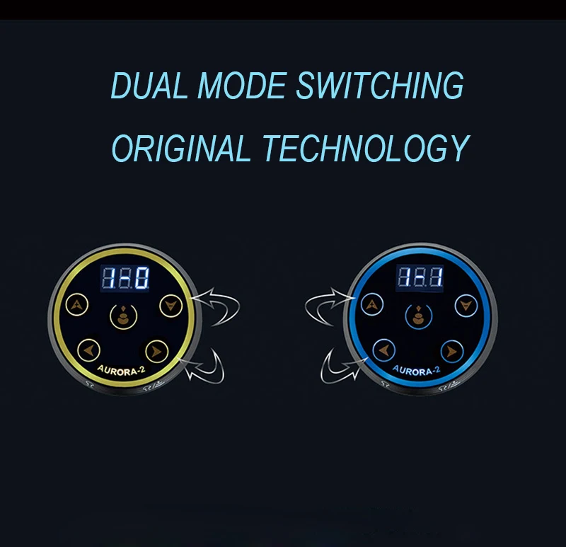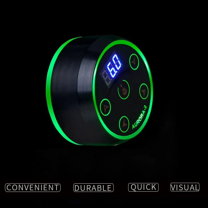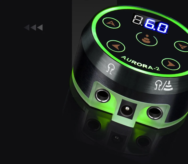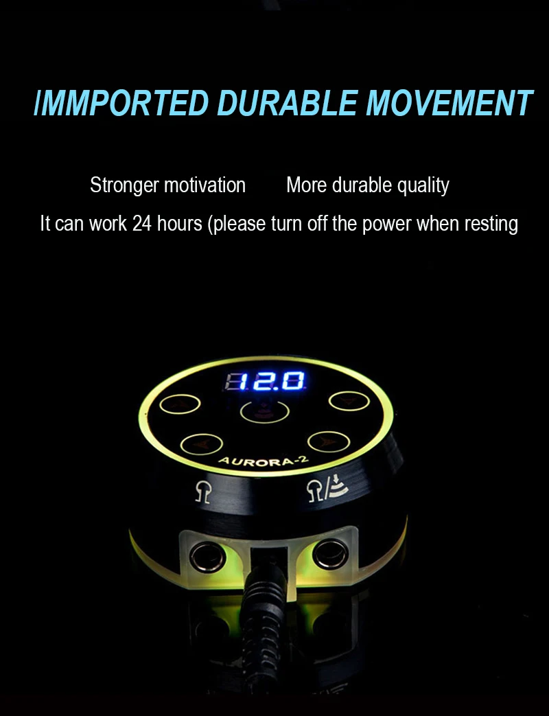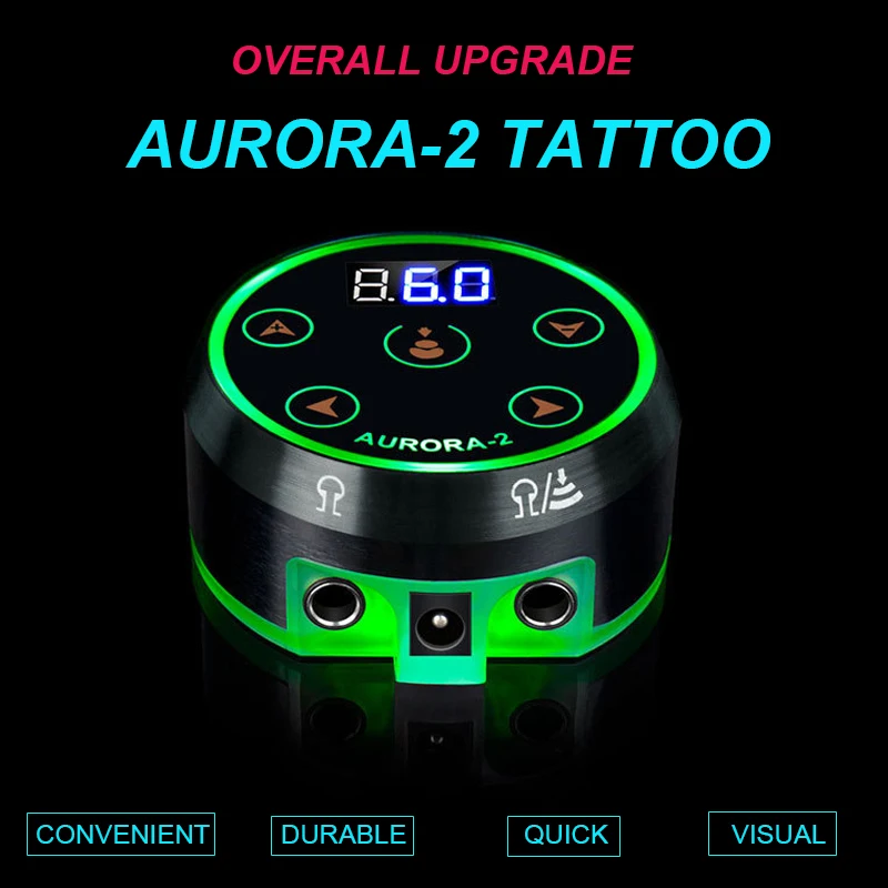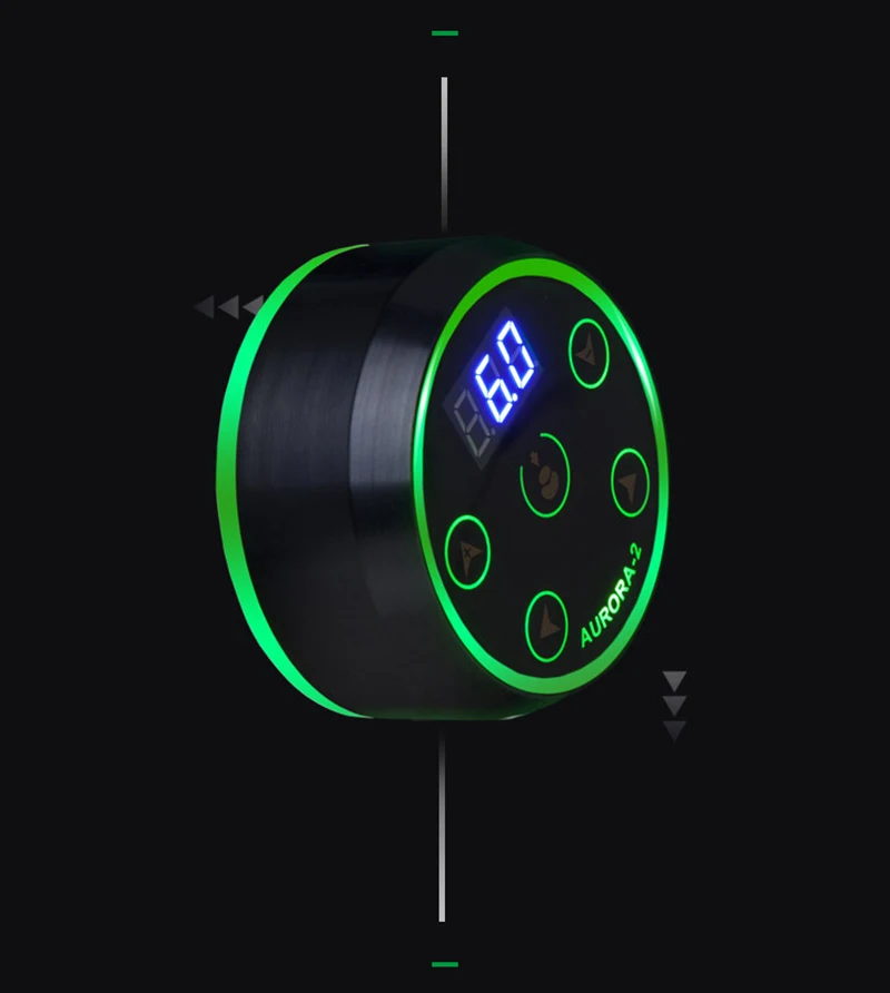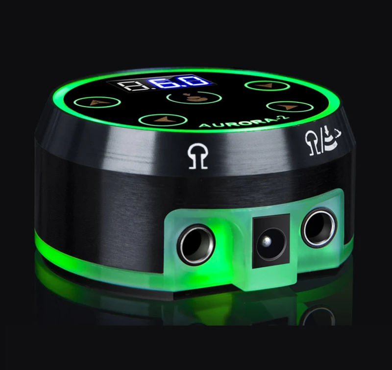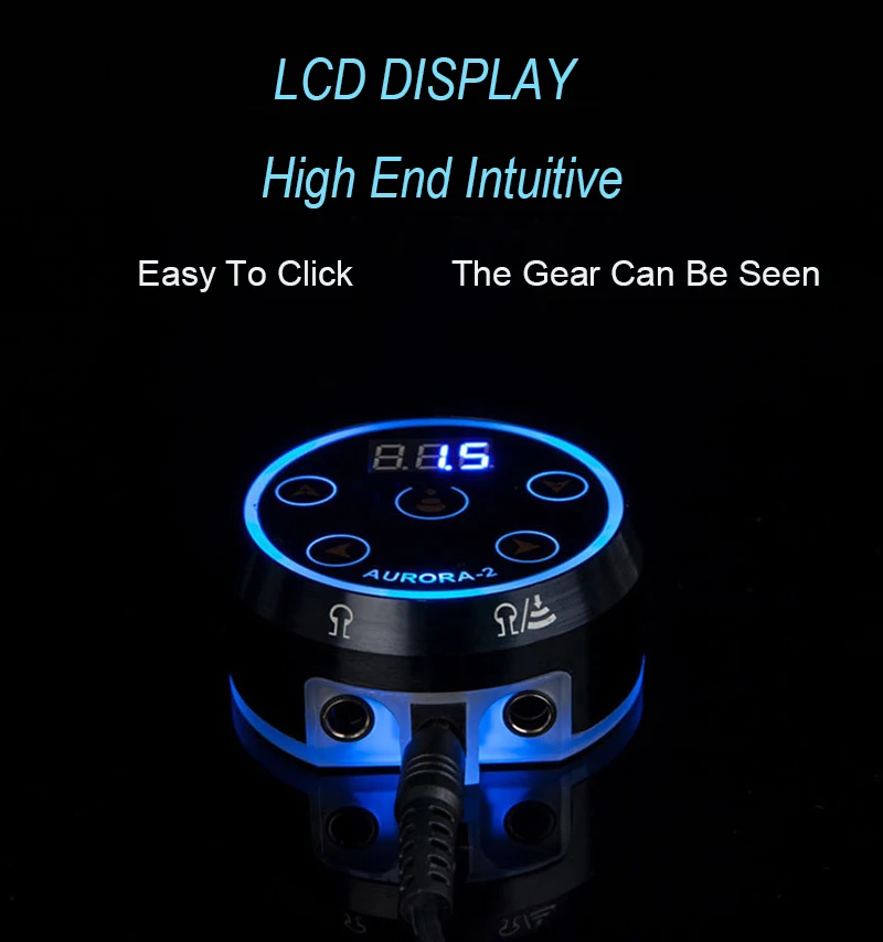 【1】Aurora 3 tattoo power supply features a smart touchscreen, dot box function, and colorful LEDs that indicate the current-voltage range, build-in timer, dual output, 3 preset voltage, magnetic and anti-slip base.
