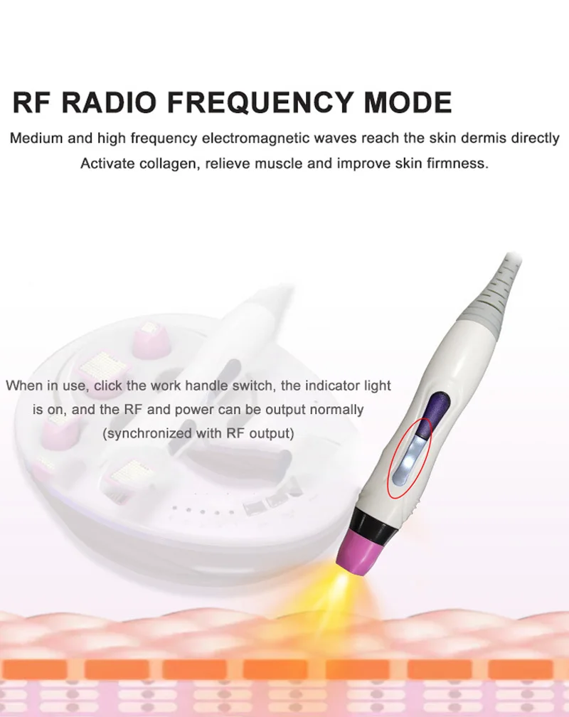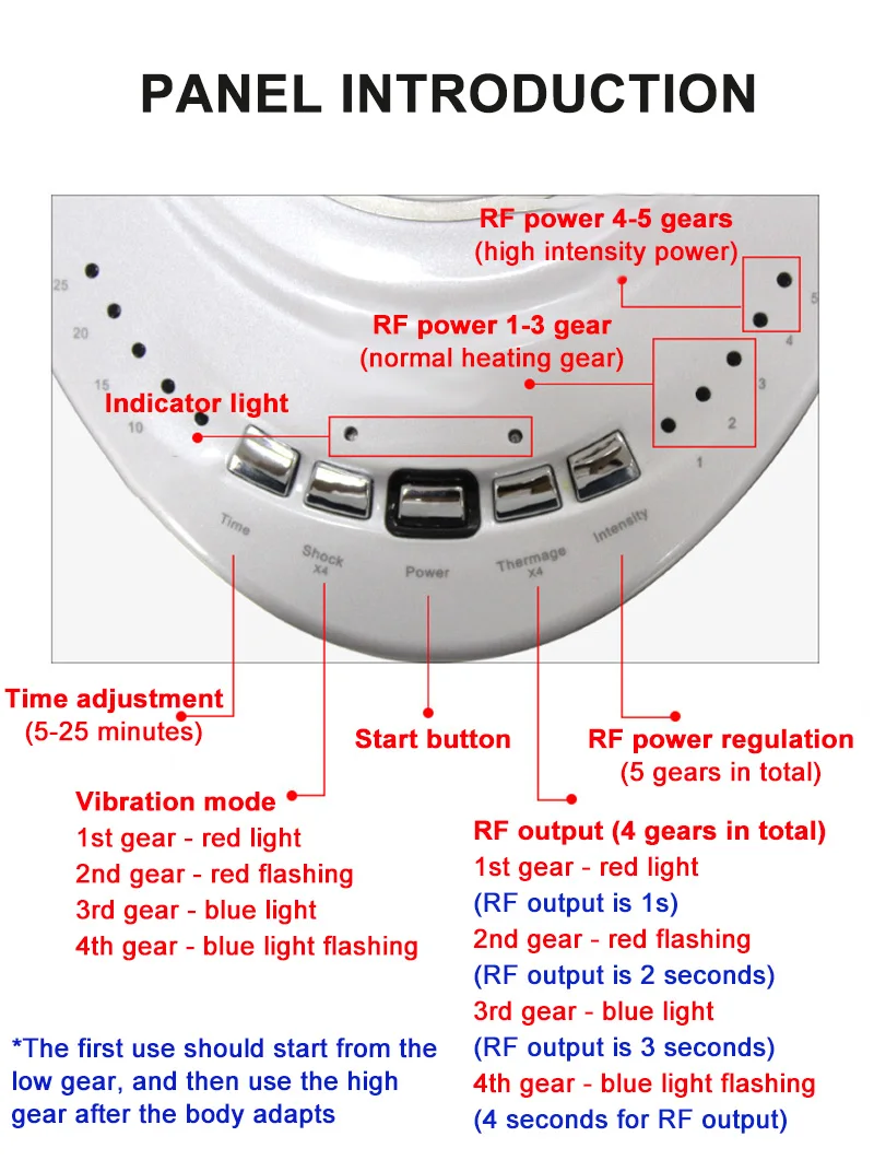 Time Mode: 5 Gears(1-3 gear of RF power is the normal heating gear,4-5 gear is high-intensity power)