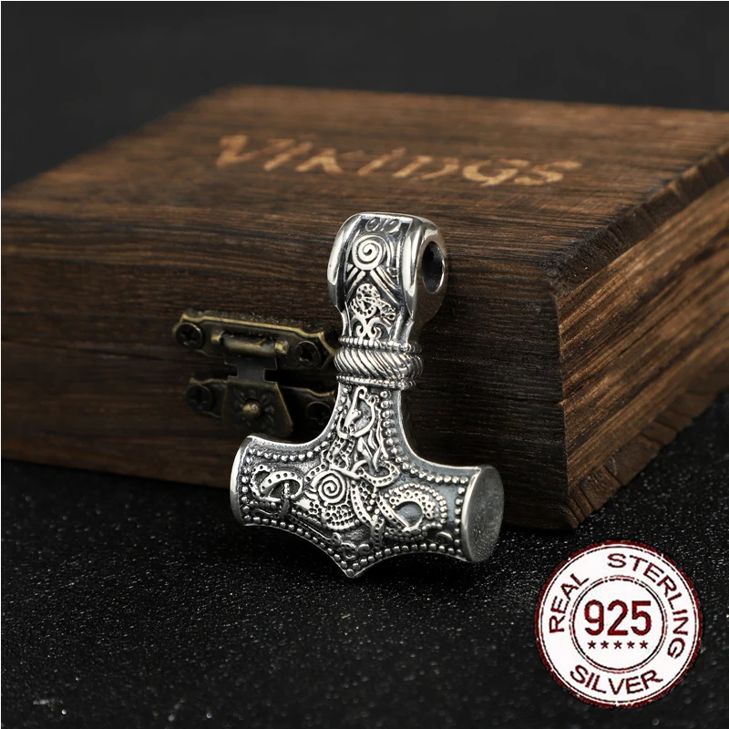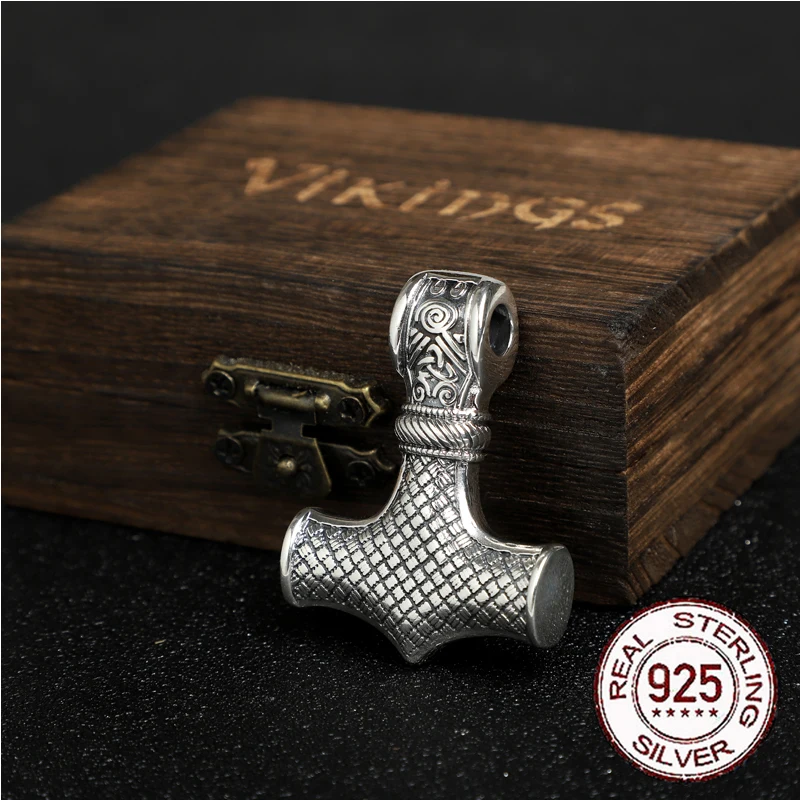 Name:S925 Sterling Silver norse Viking thor’s hammer mjolnir pendant necklace with leather chain wood box as gift