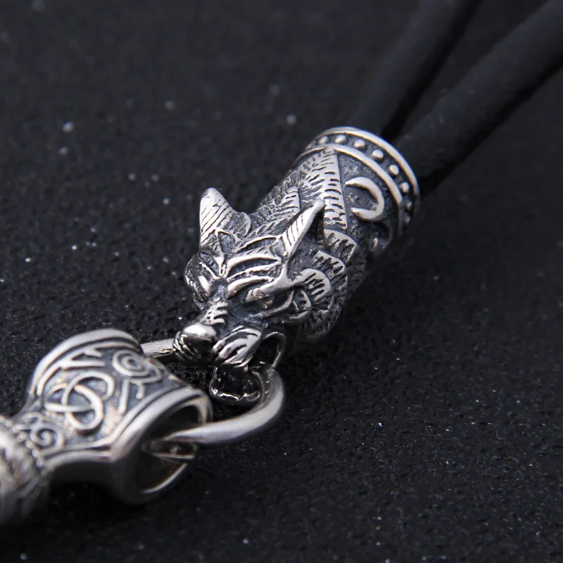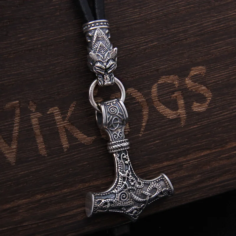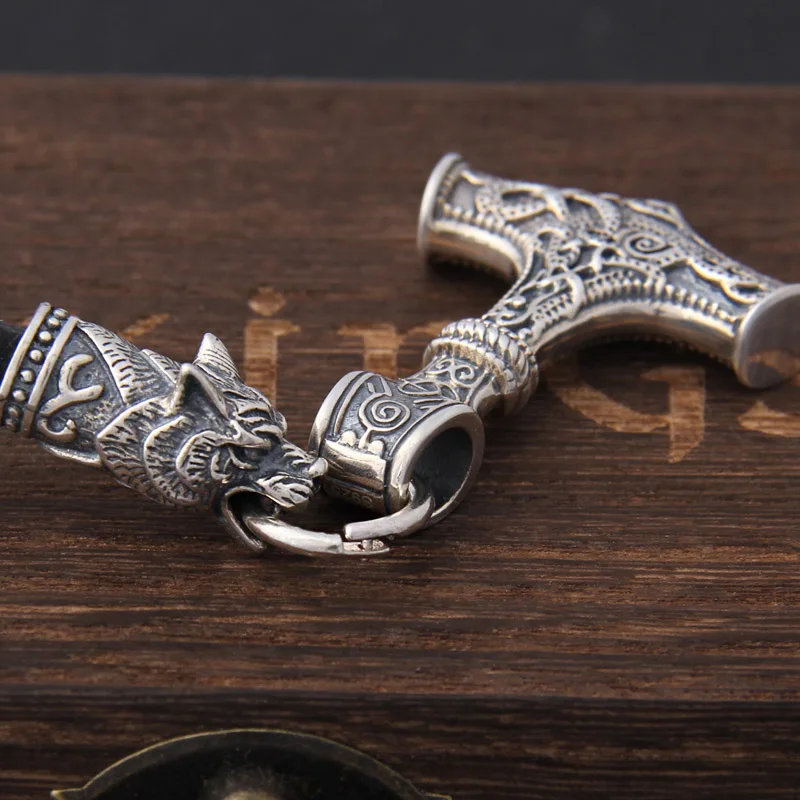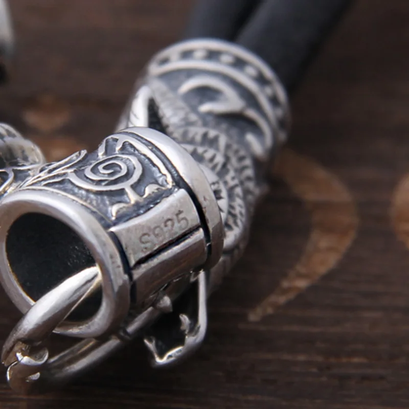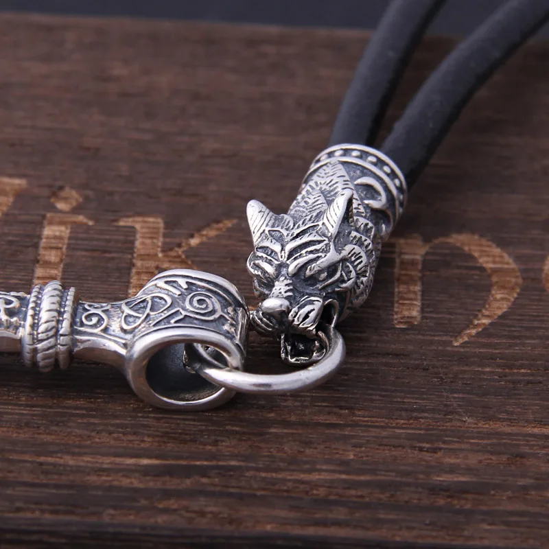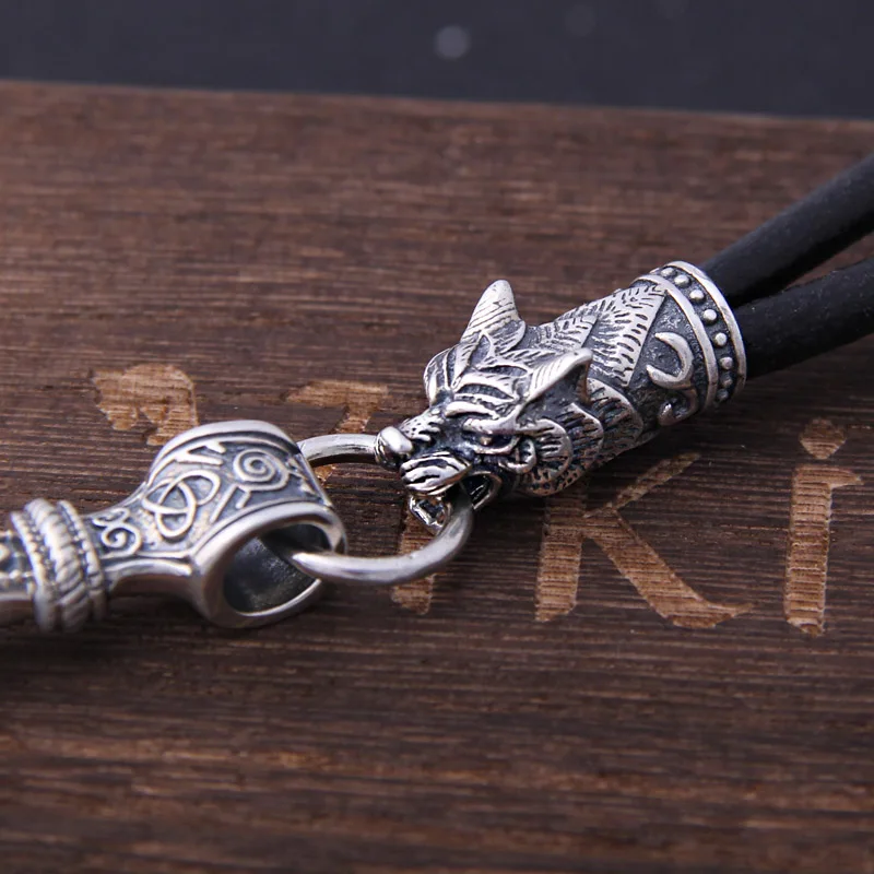 Name:S925 Sterling Silver Viking Wolf heads with thor’s hammer mjolnir pendant leather men necklace as christmas gift