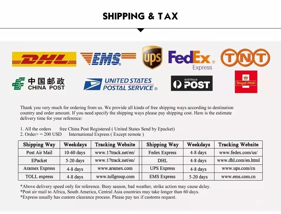 Packages from our warehouse in China will be shipped by ePacket or EMS depending on the weight and size of the product. Packages shipped from our US warehouse are shipped through USPS.