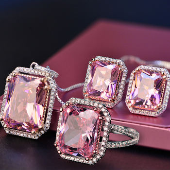 Top Quality 925 Silver Jewelry Sets Pink Quartz Cubic Zircon Ring Earrings Pendant Necklace Jewelry Set Wholesale Fine Jewelry