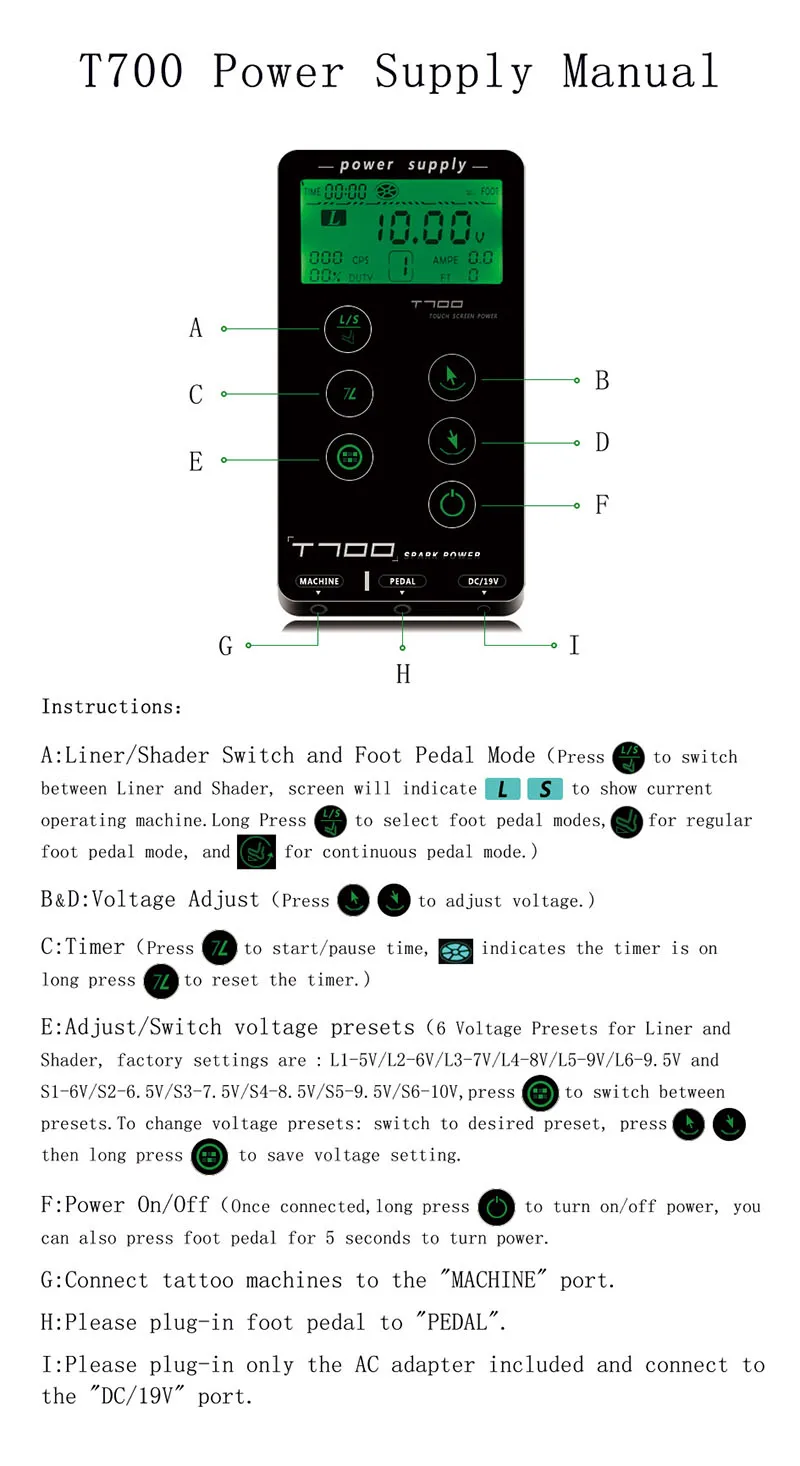 A: Liner/Shader Switch and Foot Pedal Mode (Press “L/S/V button” to switch between Liner and Shader, screen will indicate “L/S button”to show current operating machine. Long Press”L/S/V button” to select foot pedal modes, “V button” for regular foot pedal mode, and “V button” for continuous pedal mode.)