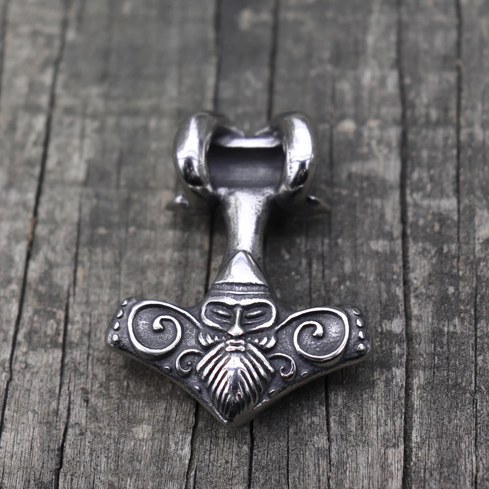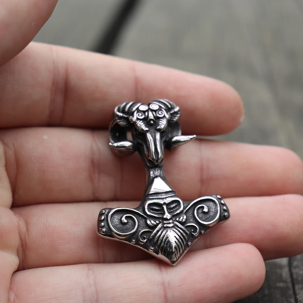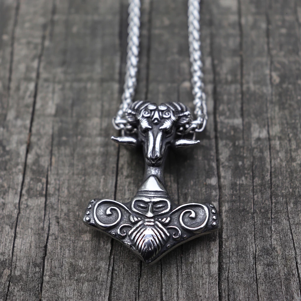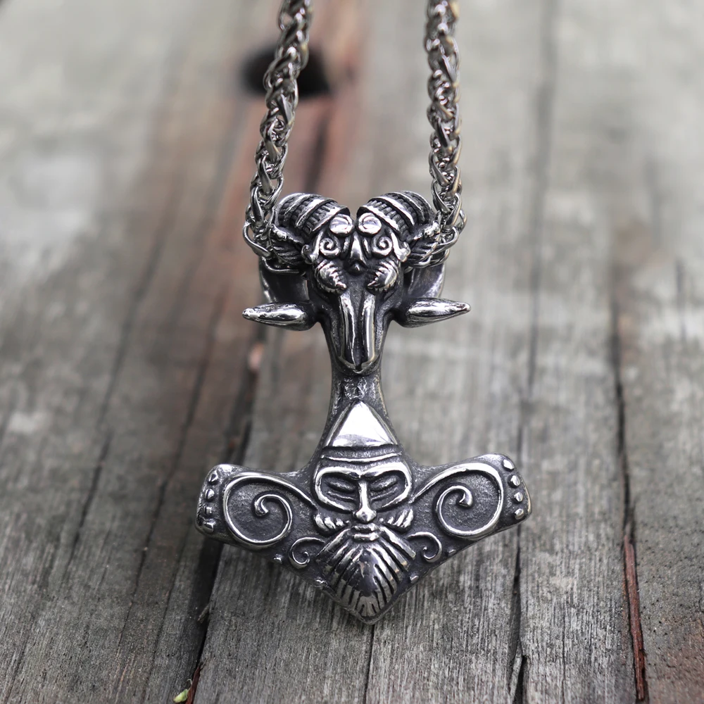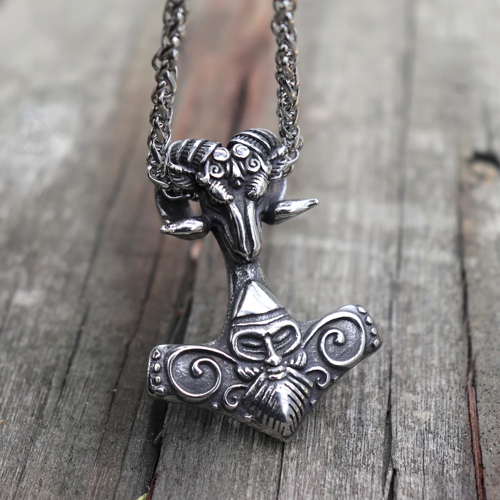 Viking Mjolnir Thor's Hammer Sheep Heads Pendant Nec…