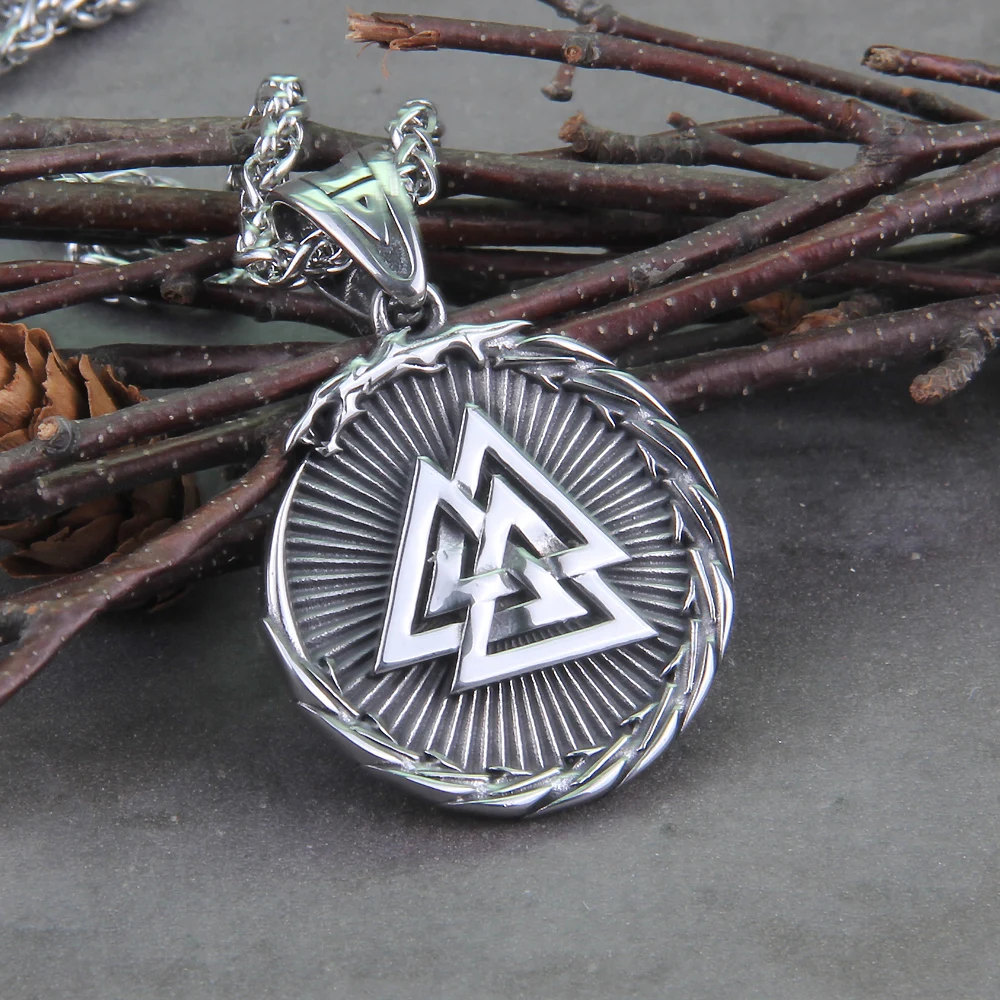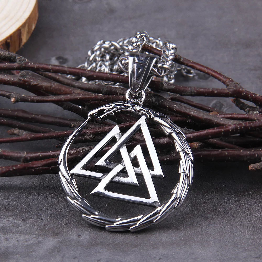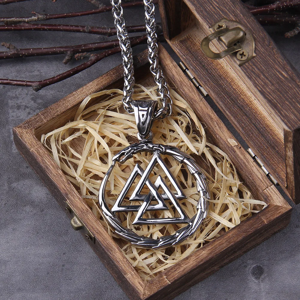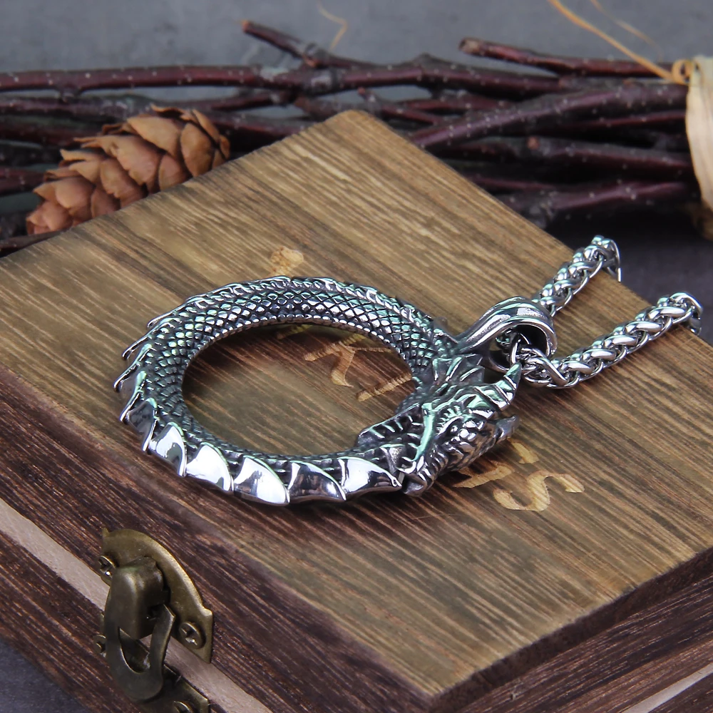 Name:Never Fade Men Stainless steel Viking Self-devourer Ouroboros Valknut Amulet dragon Pendant Necklace with Vikings wooden box