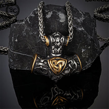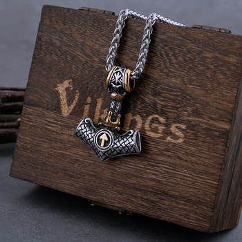Stainless Steel Thor's Hammer and Mixed Gold Odin Rune Necklace Men's Charm Amulet Pendant Viking Jewelry Christmas Gift