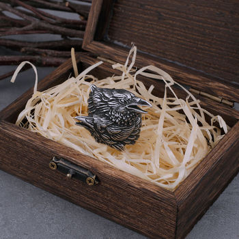 925 Sterling Silver Viking Odin Raven Hugin and Munin Ring Adjustable with Viking wood box as gift