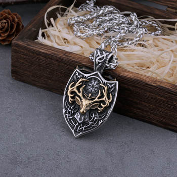 Viking Stainless Steel Mixed Gold Deer Head Shield and Signpost Vegvisir Necklace Men's Charm Amulet Pendant Viking Jewelry Gift